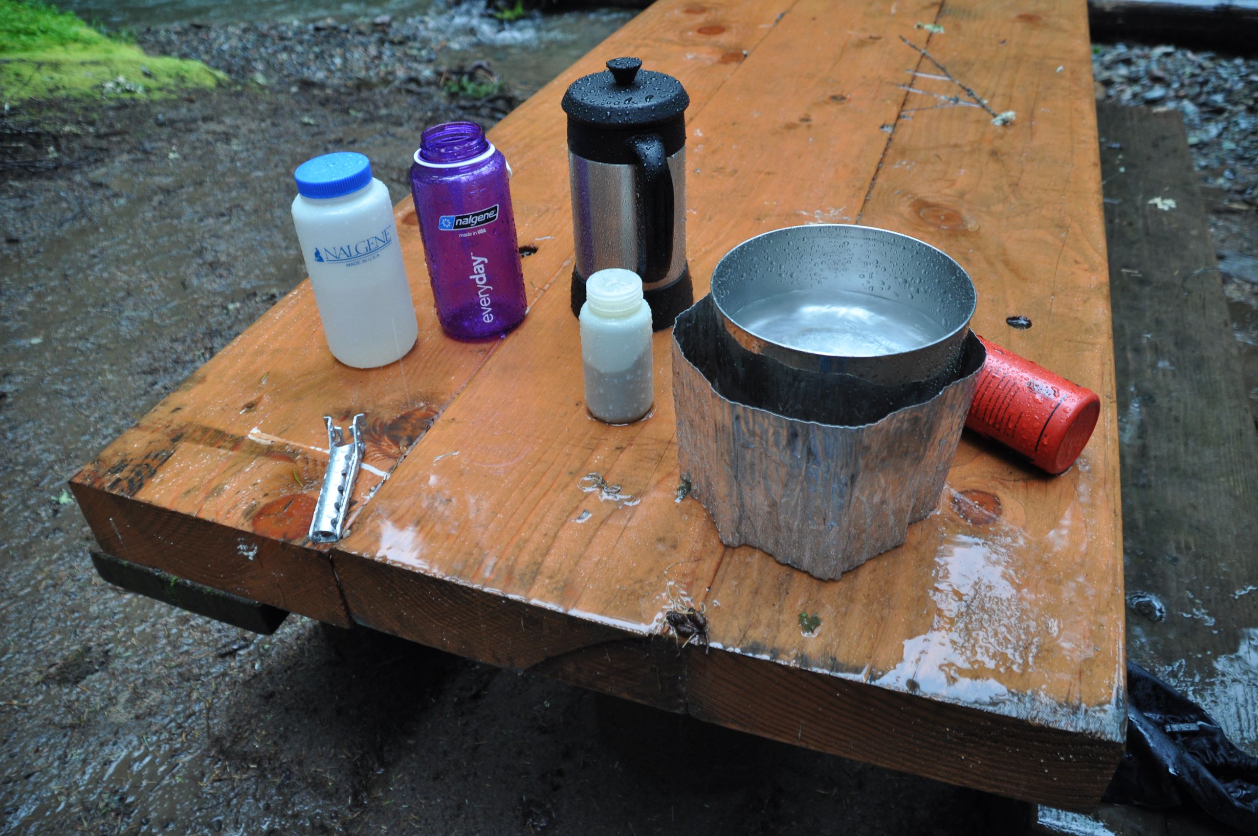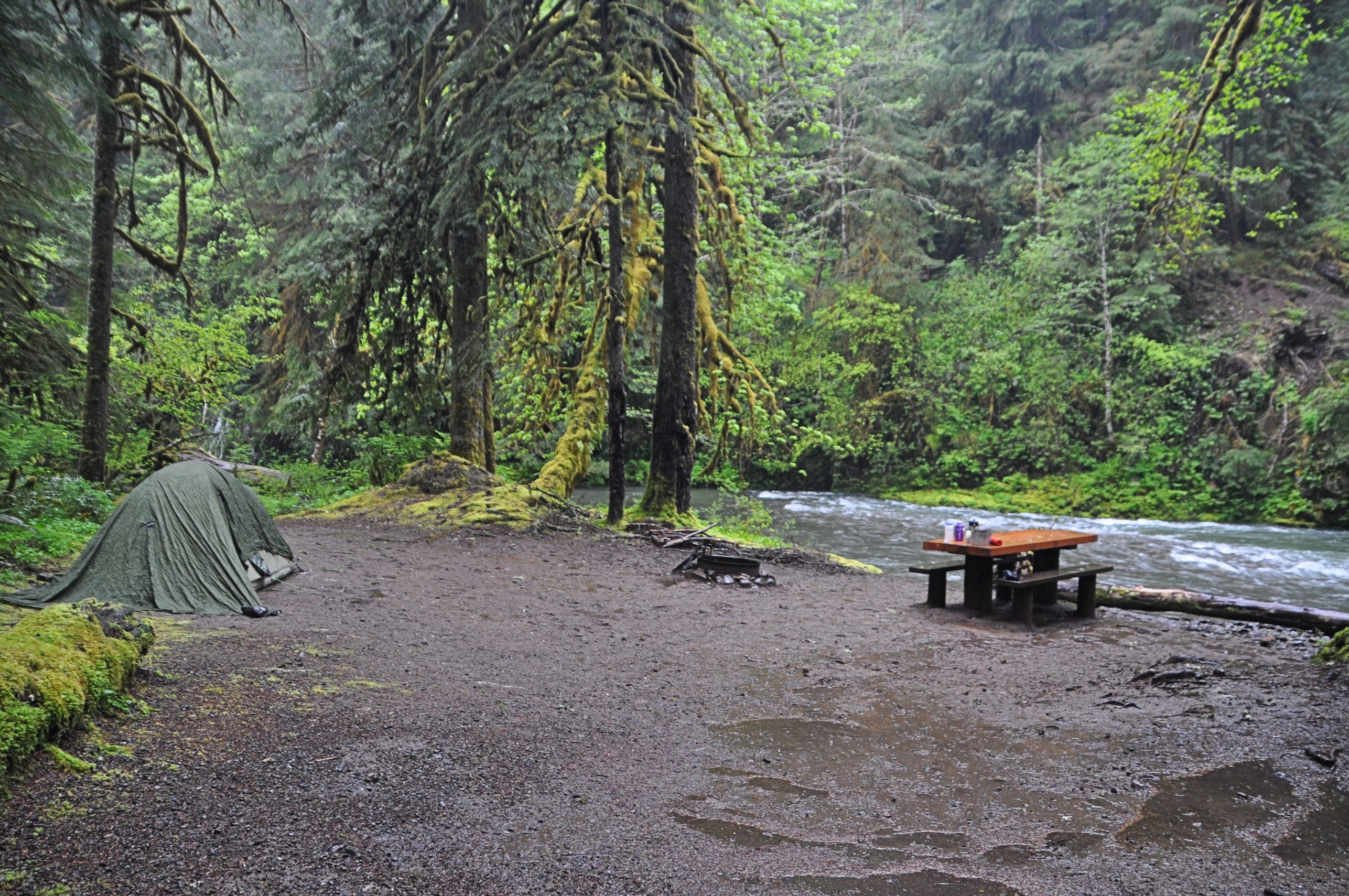 Sunday morning rain let up right about sunrise, which was handy for packing up camp. Usually, when packing camp, I spend much of the morning spreading gear over bushes and snags, letting the morning warmth dry it out. That would have been a farce this time. I rolled everything up, sopping wet, and stuffed it into the trunk of the Dragon Wagon. (Luckily the following day in Portland was sunny and warm all day, so I was able to scrub the mud off everything and dry it out well before re-packing it for storage.)