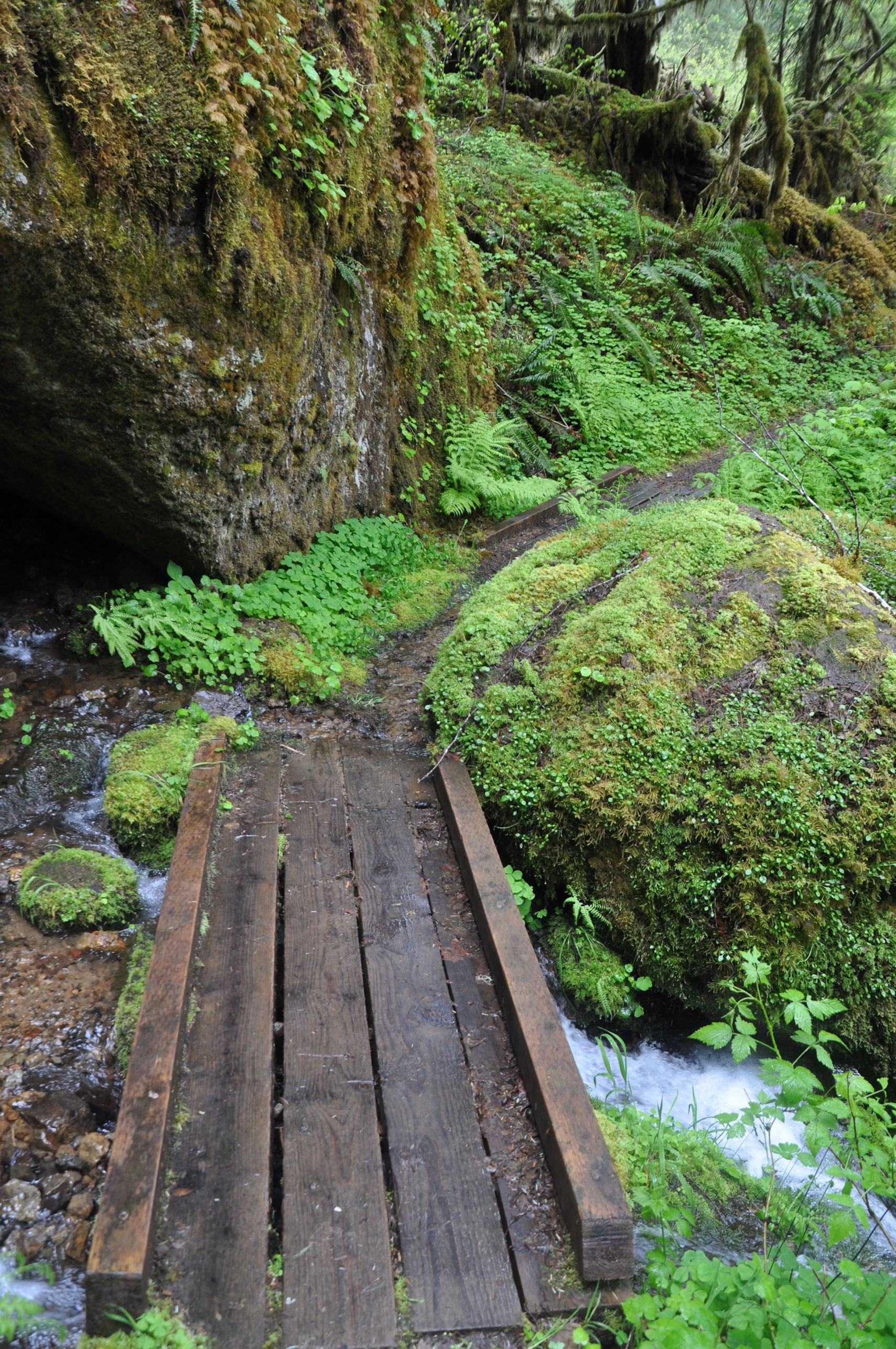 Saturday afternoon the rain fell less insistently, and we decided to hike across the footbridge to House Rock. On the way we marveled at several beautiful campsites along the river. Coming from the campground side, we saw steps built of stone, leading up to the bridge, that I had not seen the previous weekend. It’s the kind of thing one finds in old places in Oregon – stone walls built by hand, or stone benches and steps. I marvel that people of an earlier time felt that it was important to build quality features like this, putting effort into making things as beautiful as they are useful.