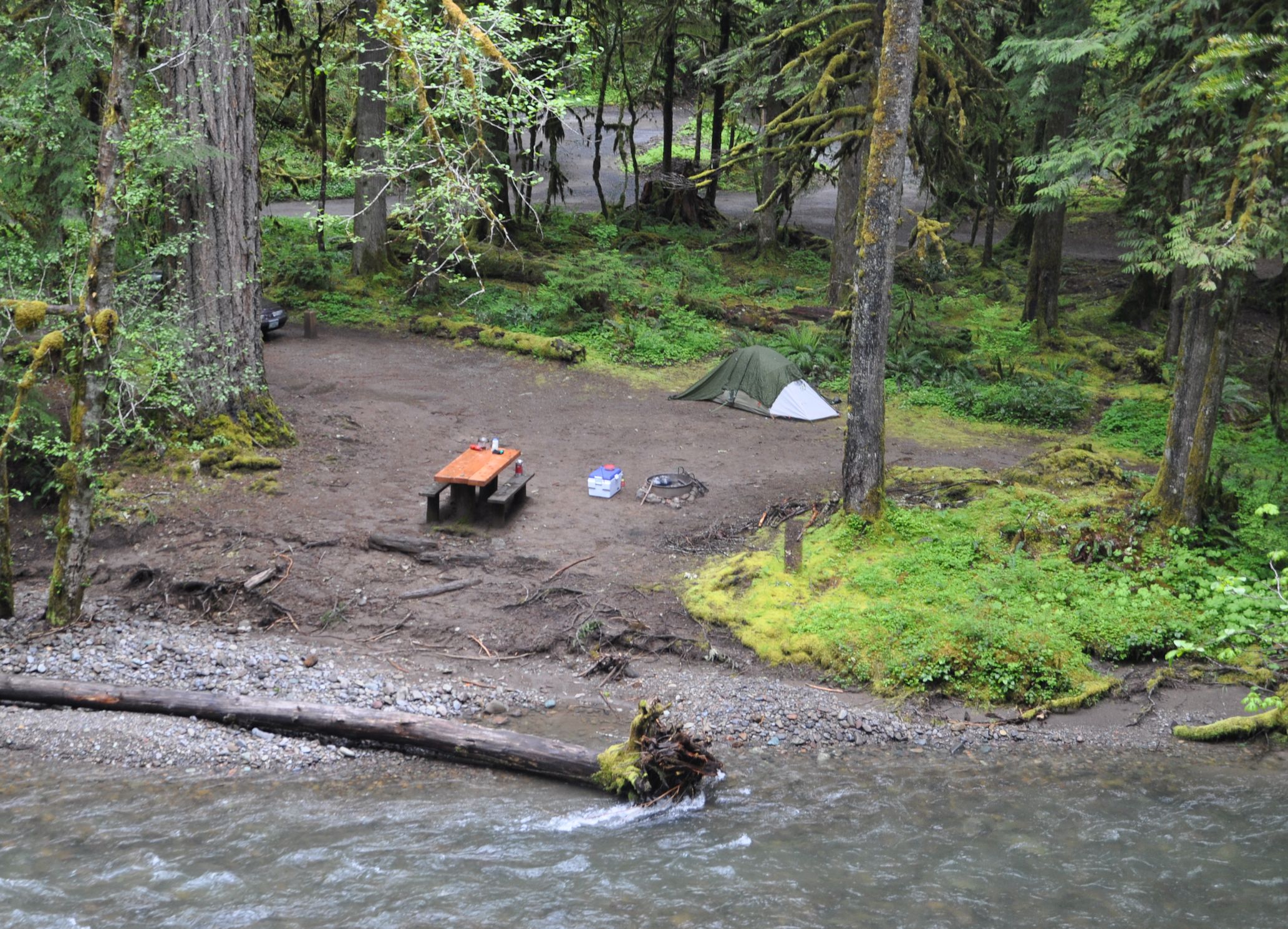 Showers are ok, and that drizzly “liquid sunshine” we love in Portland is ok, but this weekend we got a good, solid, unceasing rain. The river was high, so the lovely beach had shrunk. The campsite was filled with puddles. Rather than spread our stuff out around the campsite for easy access, we left our gear and food either in the car or the tent, to keep it dry.