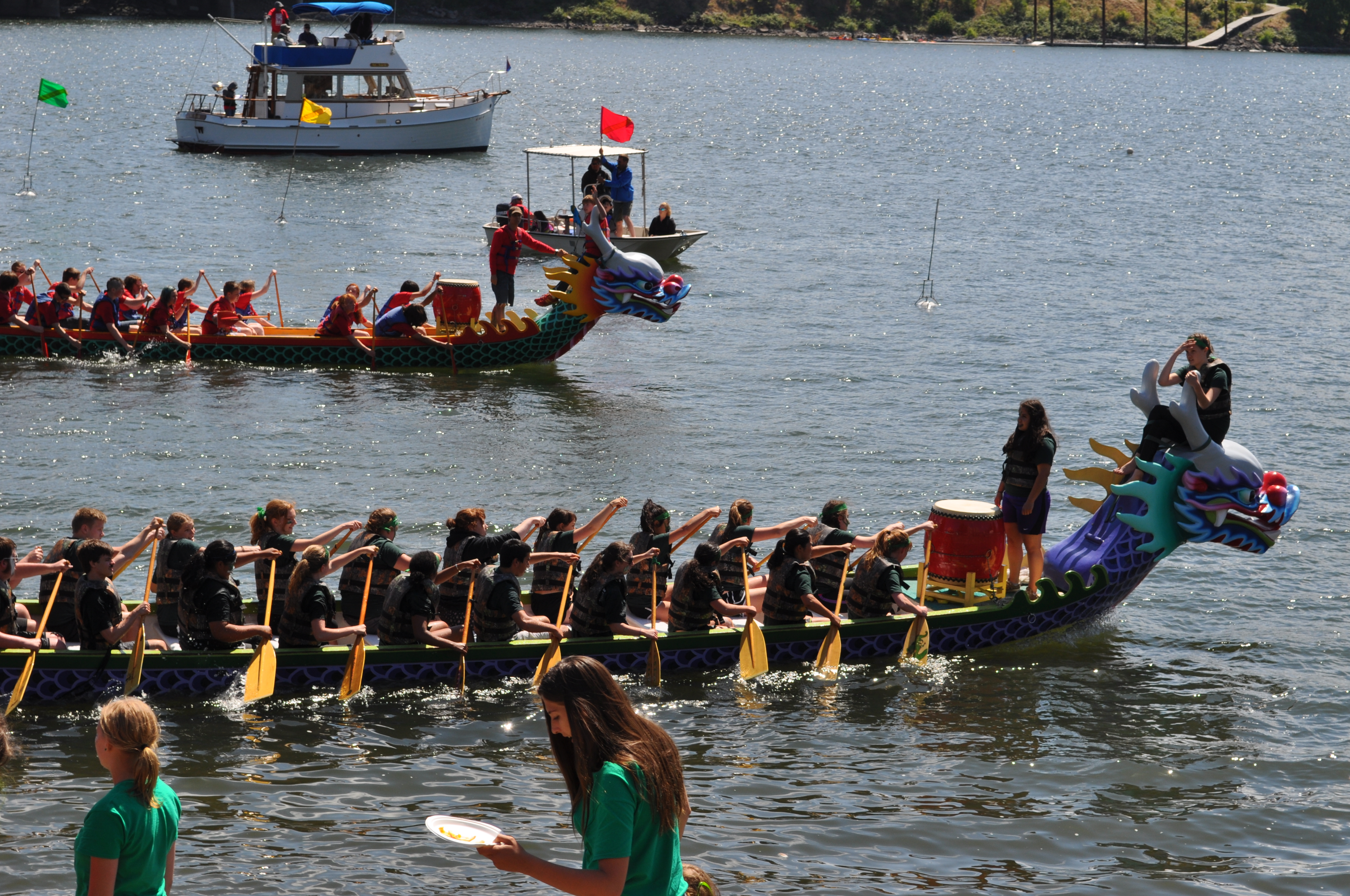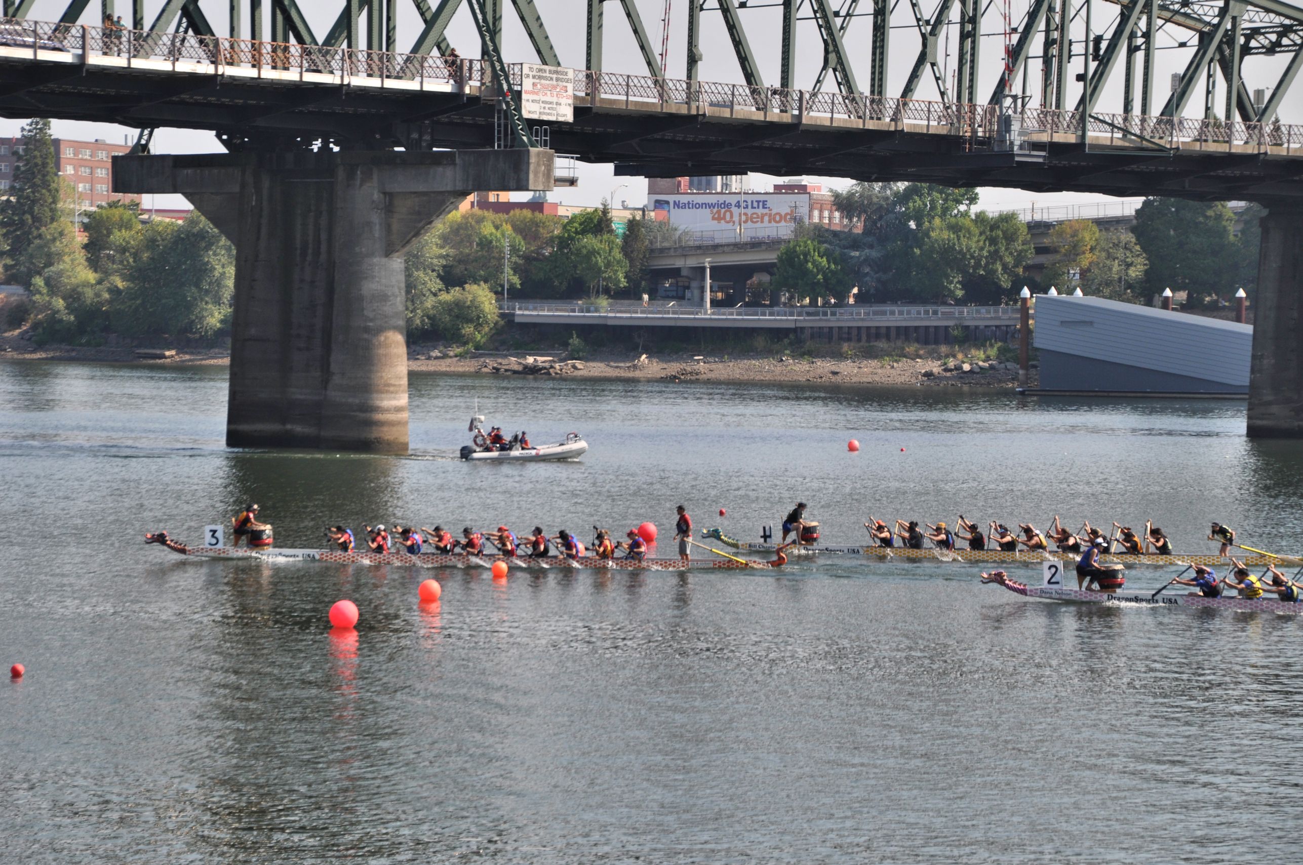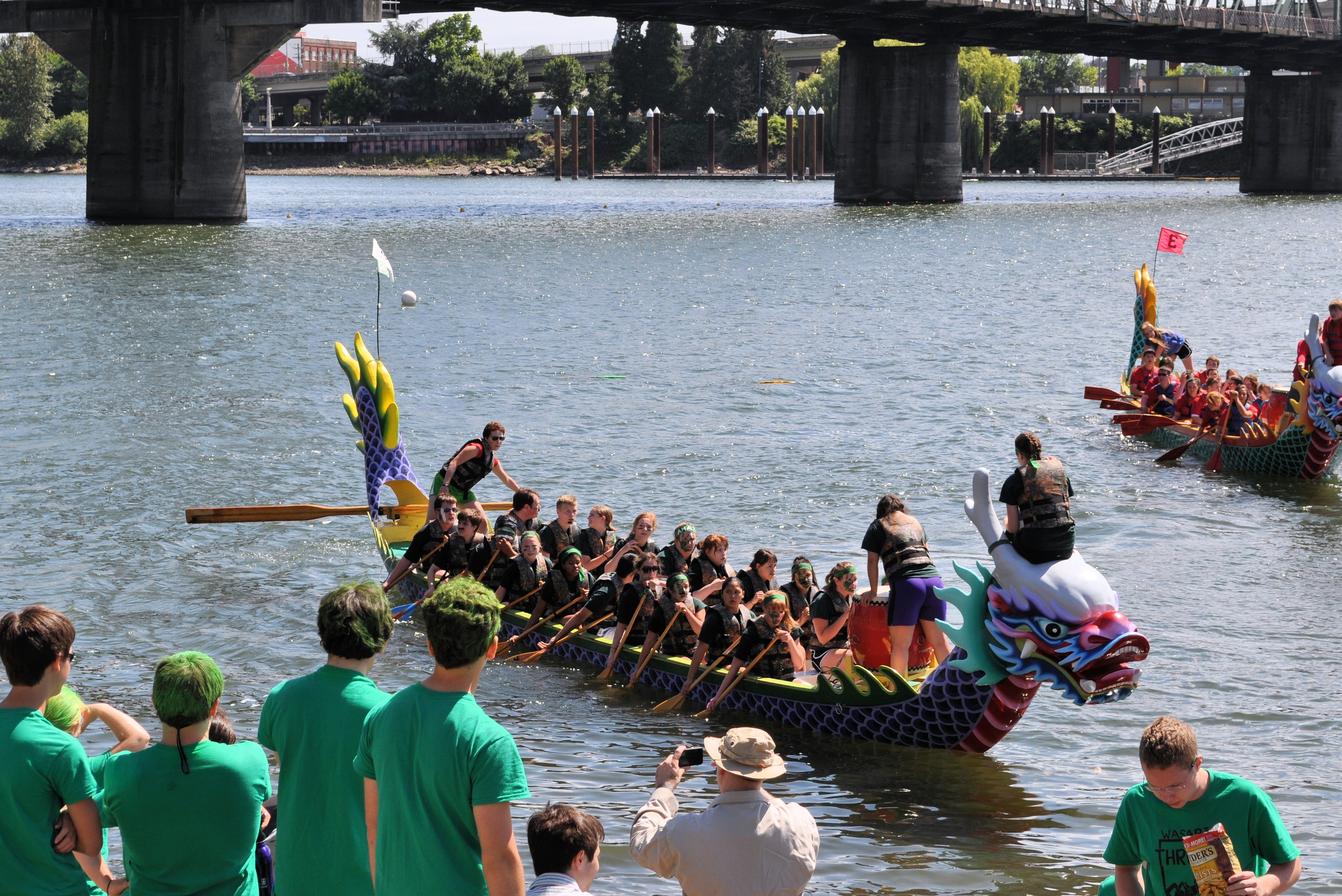 Tara and I took her friend to the Dragon Boat Festival today. They wanted to go and cheer on another friend who would be on one of the Dragon Boat teams racing, the youth team of the Bridge City Paddling Club. Dragon boating is a team paddling sport that originated in China over 2000 years ago and transformed into an international sport in Hong Kong in 1976.