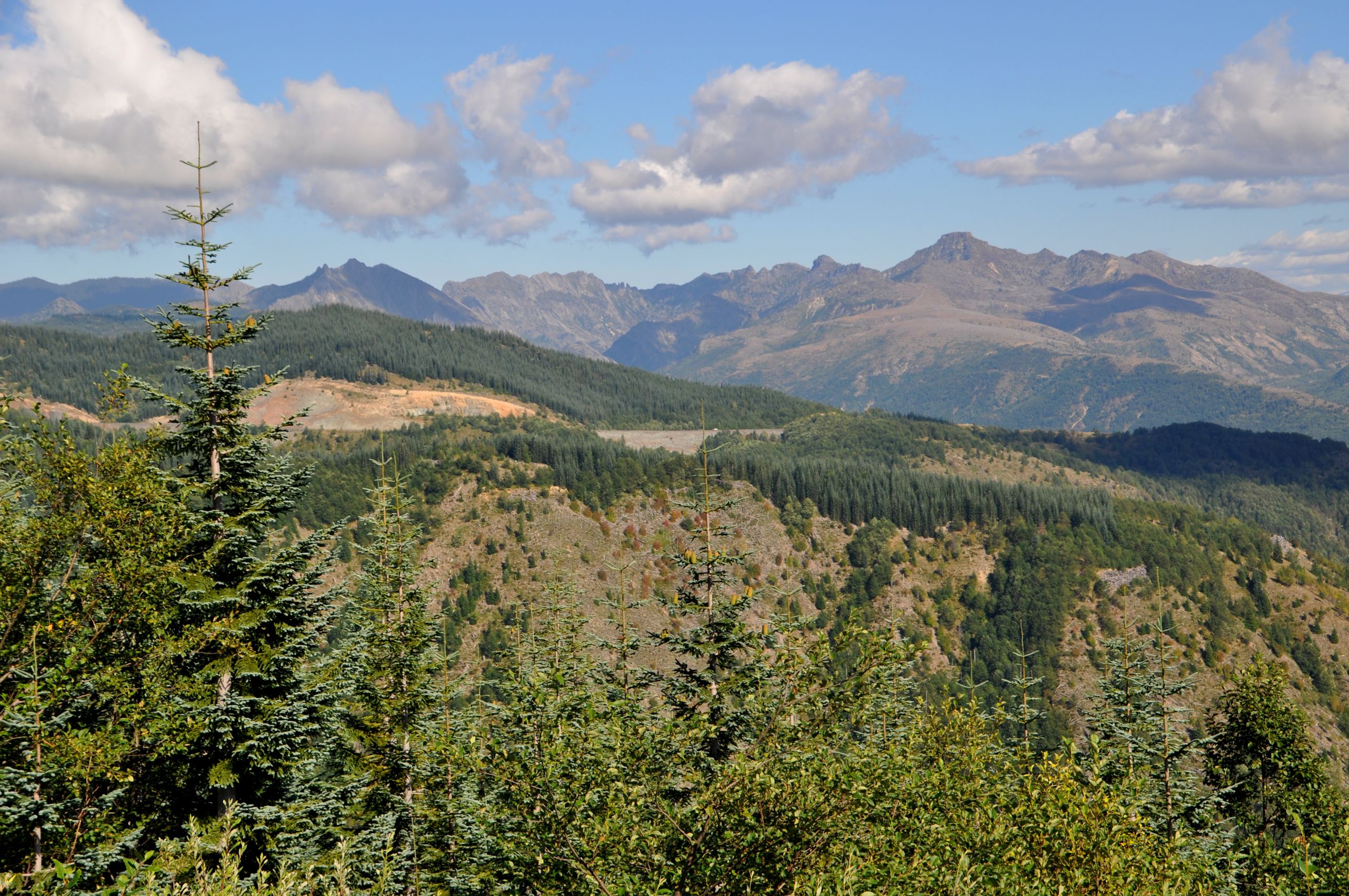 It’s an easy drive on a good road from I-5, and I was within the National Volcanic Monument in an hour, passing thickly forested hills, the homogeneous stands of Noble Fir making it obvious that the trees had been planted by the land owner there, Weyerhauser Company. There were a few vista stops, but each time I stopped, the only thing I could see was a curious, moonlike valley, and clouds obscuring anything with elevation. That was frustrating, because much of the sky was cloudless blue, and only the highest peaks around St. Helens were obscured.