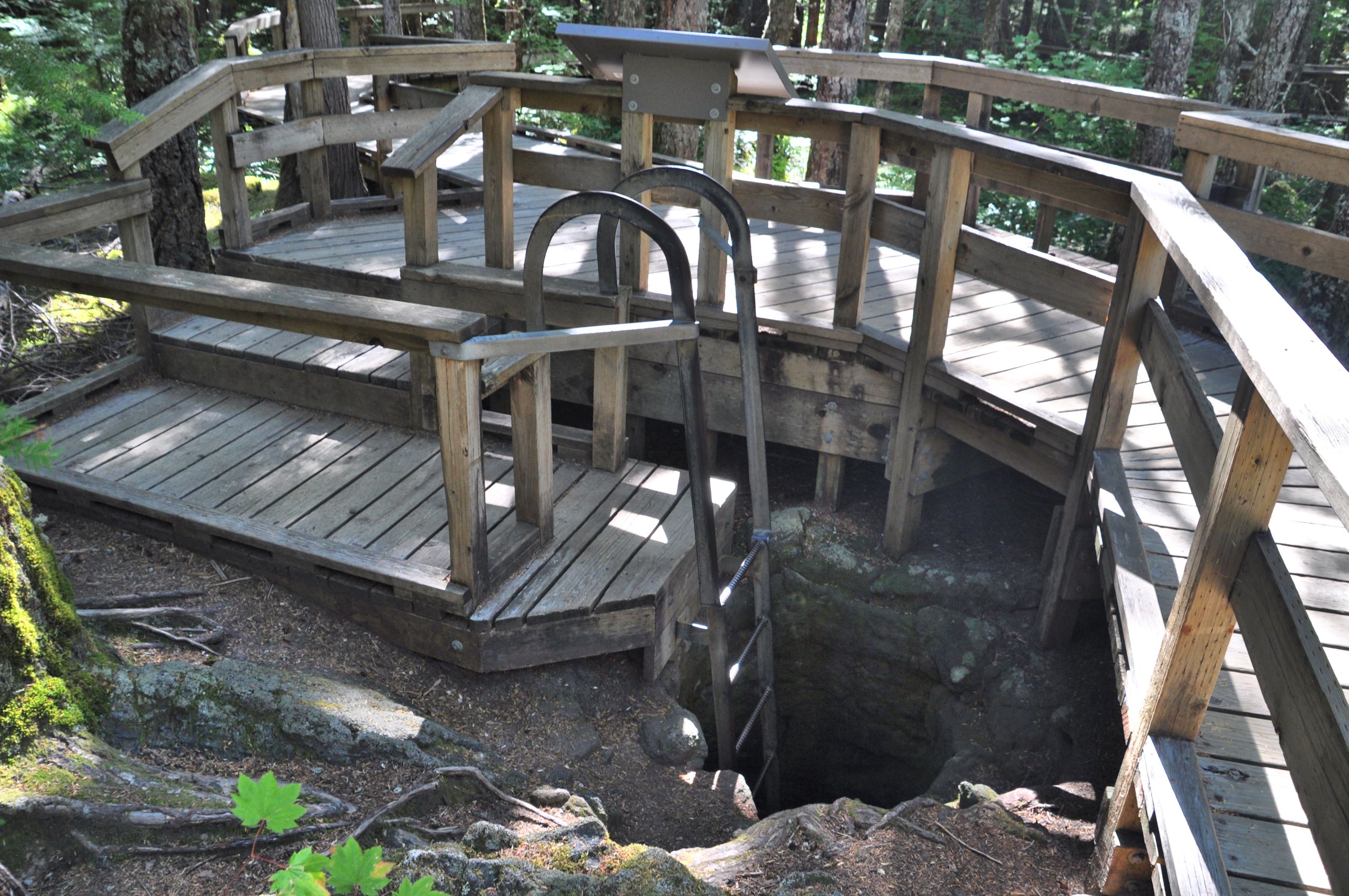 The trail is entirely on boardwalk, and makes a short loop through the forests. The two forests mentioned here are the one that exists today, and the one that disappeared in the lava flow that created Ape Cave. Hollow shells where trees used to be are well-preserved here. It takes hardly any imagination to visualize what was there when the lava struck, since the lava shells tell the story.
