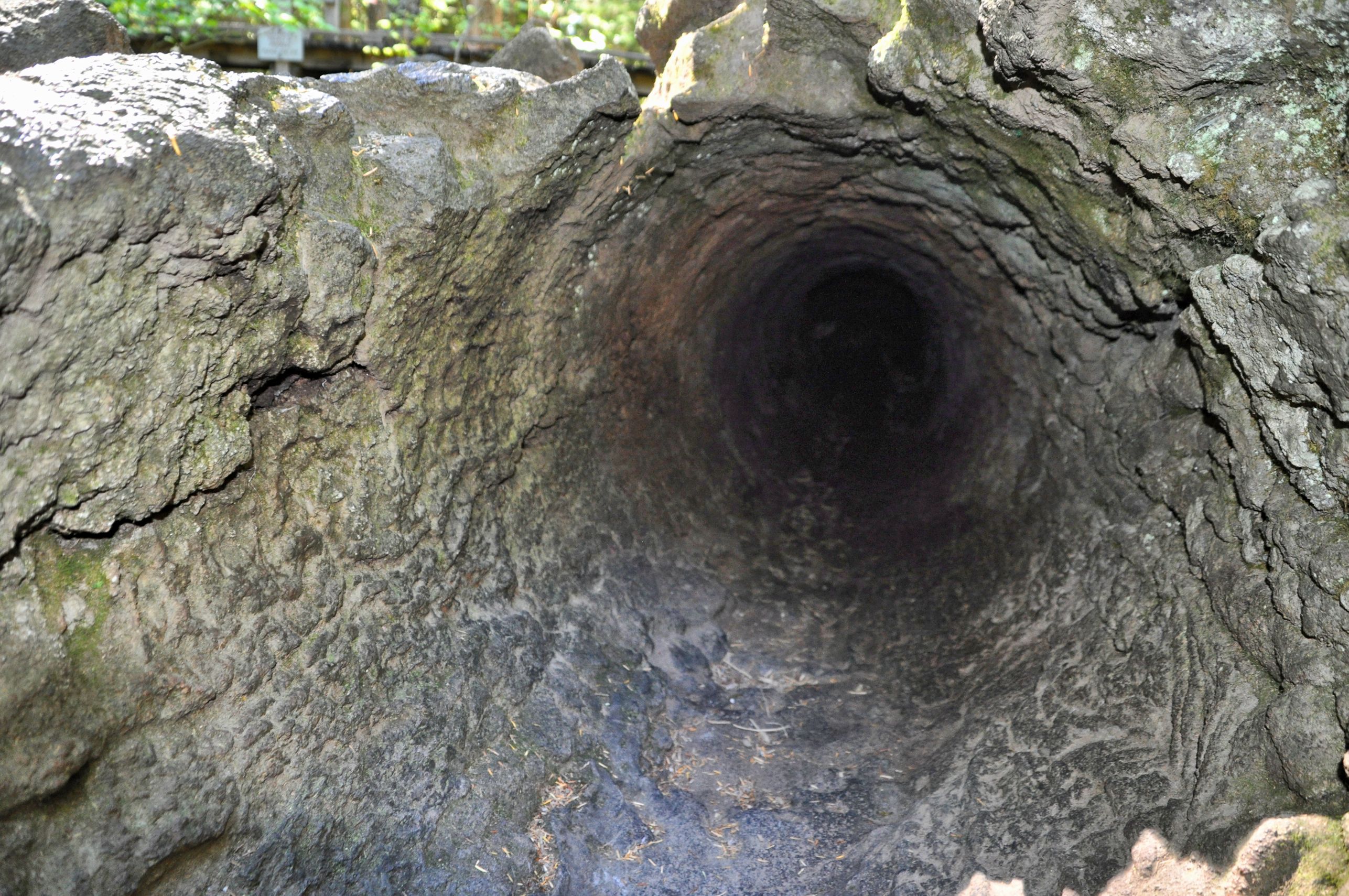 Molten lava oozed into the forest, surrounding huge logs and eventually cooling and hardening. In the meantime, the wood caught on fire and burned up. What’s left is big circular gaps in the forest floor marking the diameter of the trees that once were, and long tree-sized tunnels along the ground. There is a place where a couple of downed trees were beside standing trees, so the hollow tubes all connect. From the boardwalk you can climb down a ladder into one tree hole, and then climb into a horizontal tunnel, following the path where a tree once lay. Halfway through, you turn a corner into a hole left by a second tree lying down, and at the end, climb back out through the hole from another standing tree. (It also makes one a bit in awe of the size of trees…)