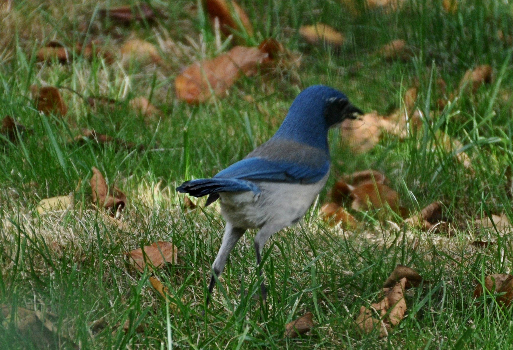 A little later, I watched the same scenario again, with another peanut, and a leaf. (That morning I had emptied the last of the contents from my peanut bag, that I keep to feed the squirrels.) I looked it up online, and sure enough, Western Scrub-Jays will cache food. I learned something new today!