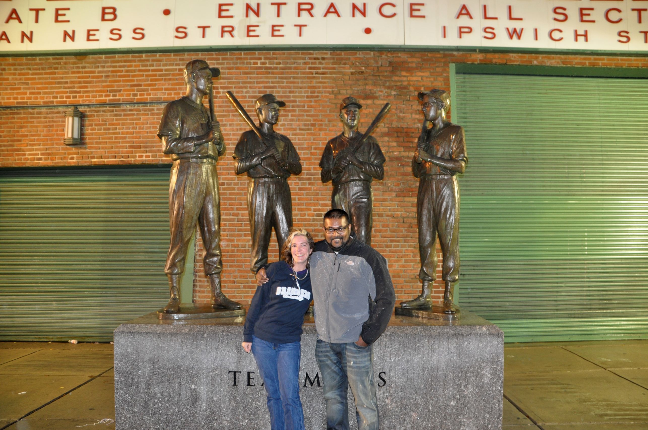 Next it was time to visit Fenway. Sadly, though only early evening, the season brought early darkness, hastened even more by the thick clouds and rain. The ballpark was closed, and raindrops splashed my lens, but I was thrilled to be there anyway. R and Tara stayed warm in the car while M and I ran around in the rain.
