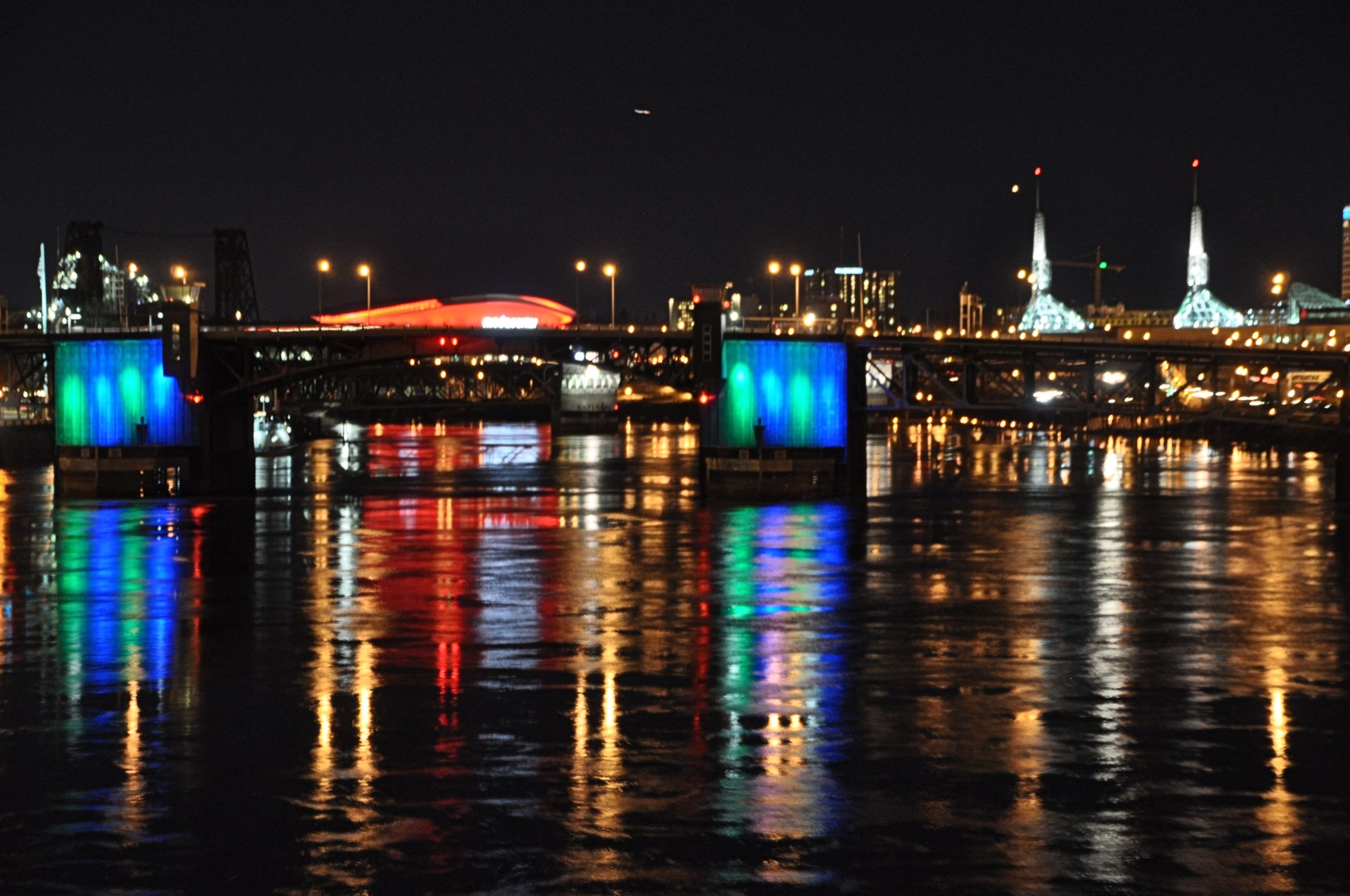 The Willamette River, Morrison Bridge with the blue and green lights, Moda Center (home of the Trail Blazers) in red, and the identical towers of the Oregon Convention Center on the right.