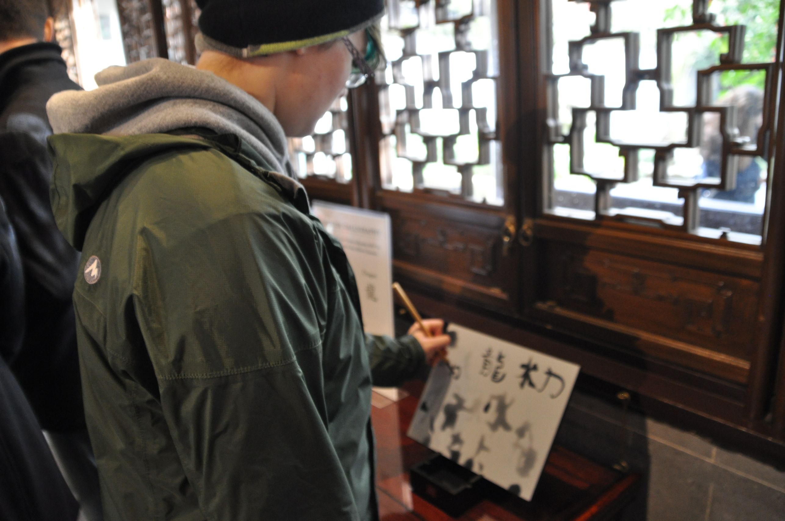 After some time the sky darkened and the rain fell harder, and we stepped into the tea house. We were able to select from a large menu of teas which was brought to us in a tea service. After we were shown how to properly use the tea service, we were left to enjoy it. Tara ordered a moon cake, and we shared that. The sweetened bean paste reminded me of the bean paste desserts I had in Japan.