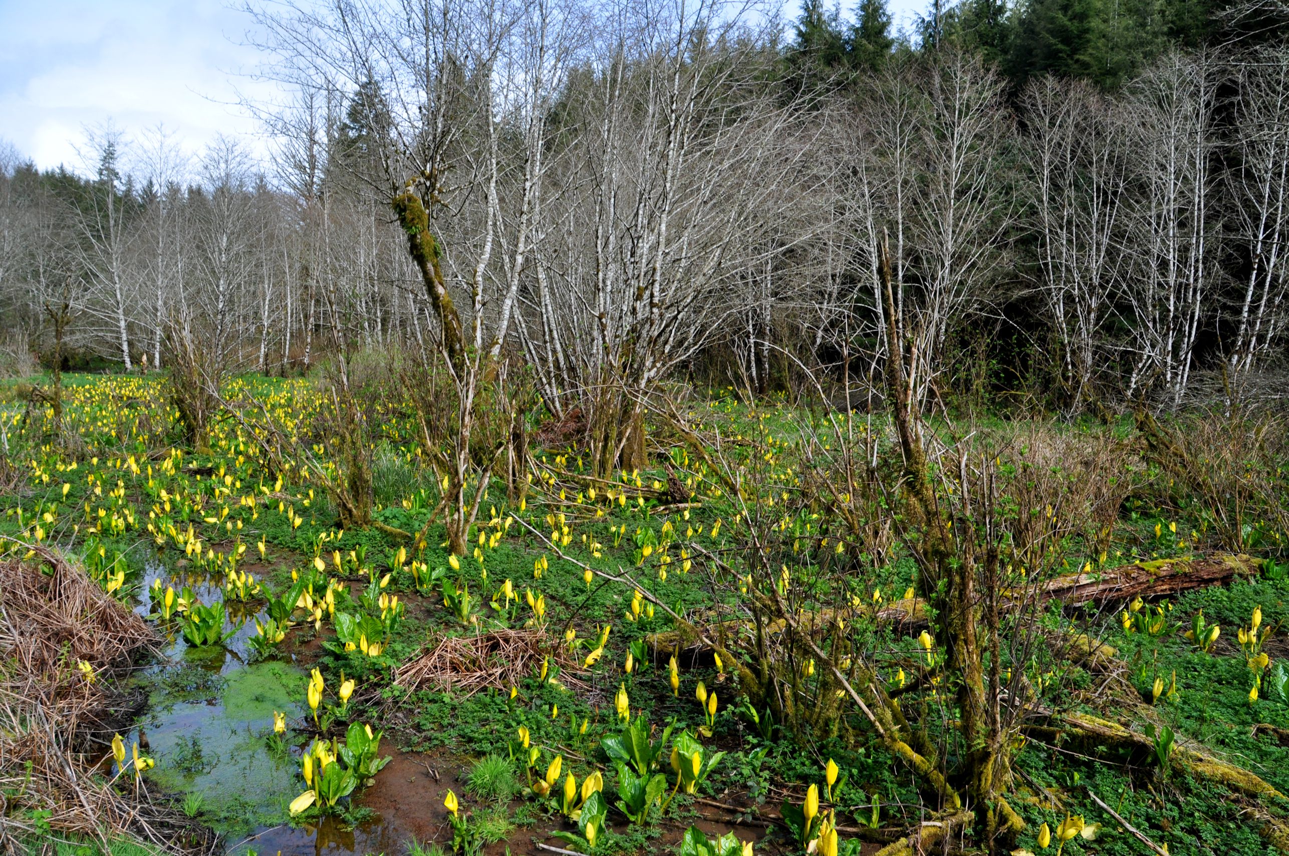 Skunk cabbage! I’d recognize that stinky flower anywhere. (Aka Lysichiton americanus. http://en.wikipedia.org/wiki/Lysichiton_americanus)