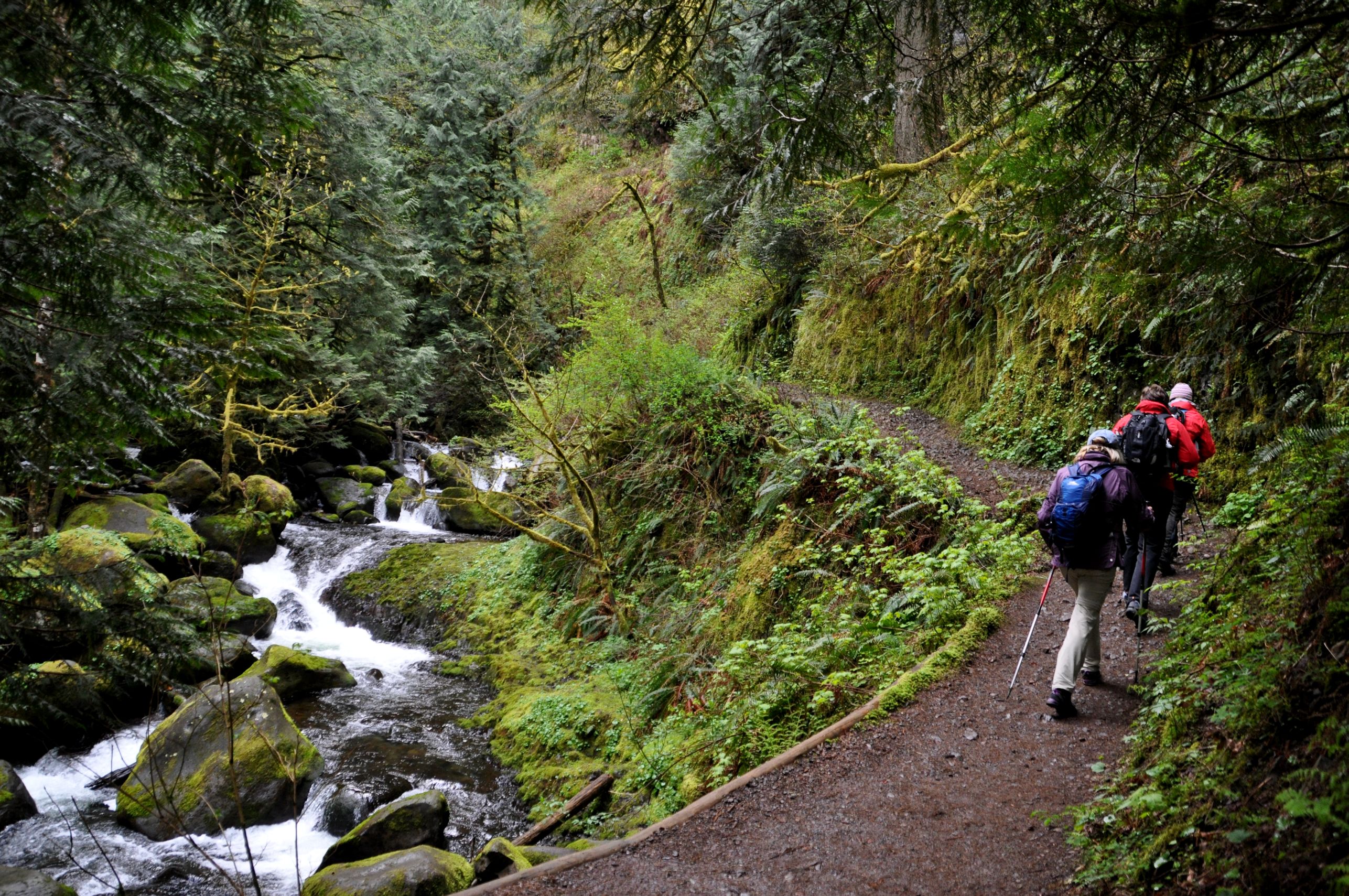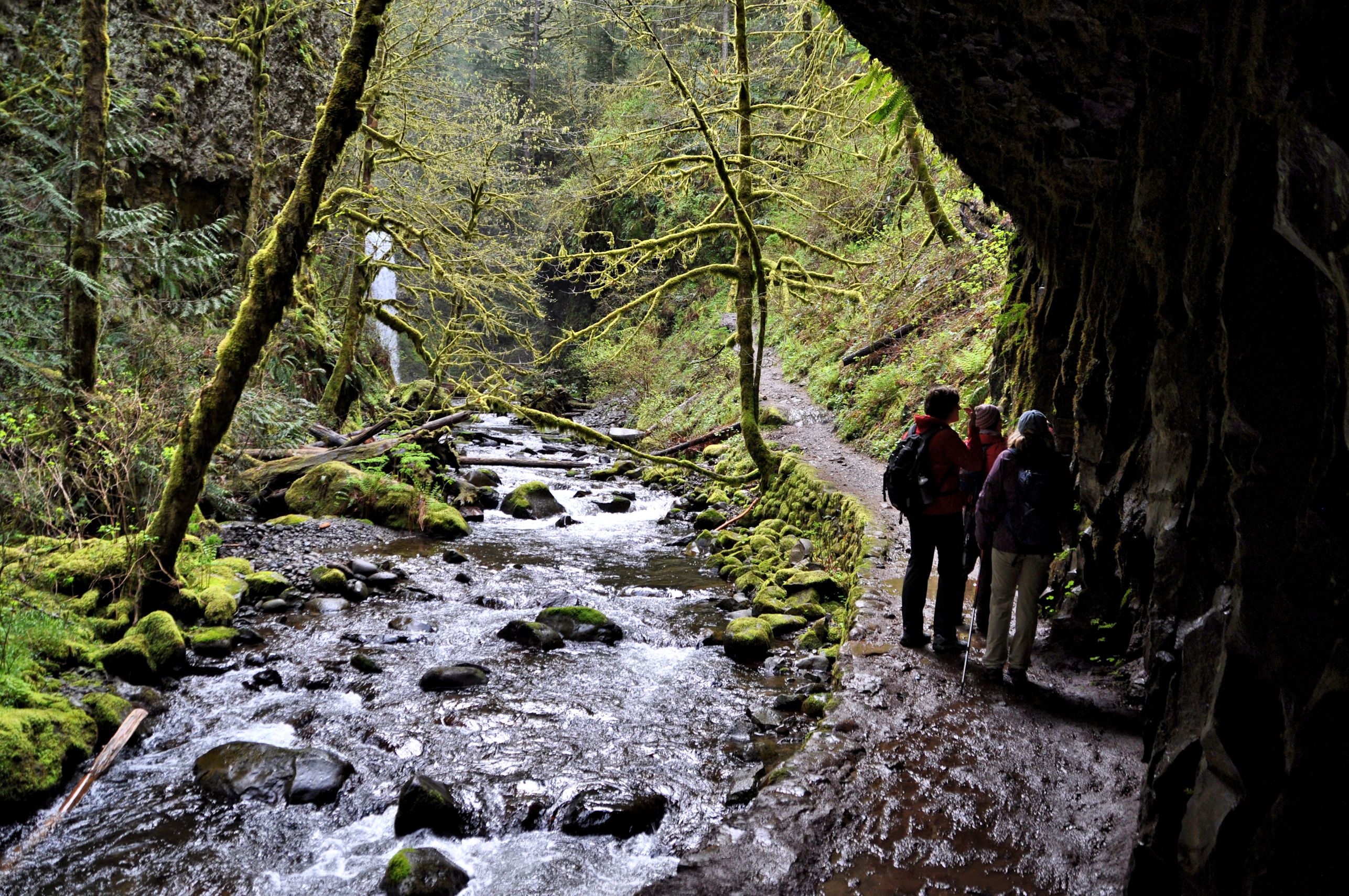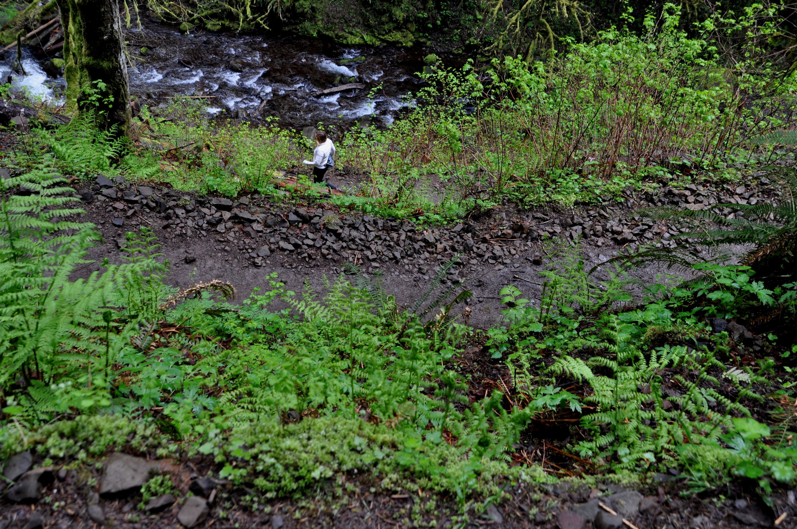 The trail after that is not paved, but is in great shape and there are so many more remarkable waterfalls I lost track. I included several photos of my hiking companions on the trail, to help with perspective, and add a contrast to the extravagant opulence of all the green. The ground was wet from a lot of run off and creeks crossing the trails, but we found solid purchase for our feet for the first five miles. We crossed five bridges, if my memory is correct, and each one of those was an adventure in itself. The first over Multnomah Falls, then a Troll Bridge, one that warned us it was falling apart, and two very sturdy bridges built from a single log with the top flattened for us to walk on, and a railing attached to one side. So clever.