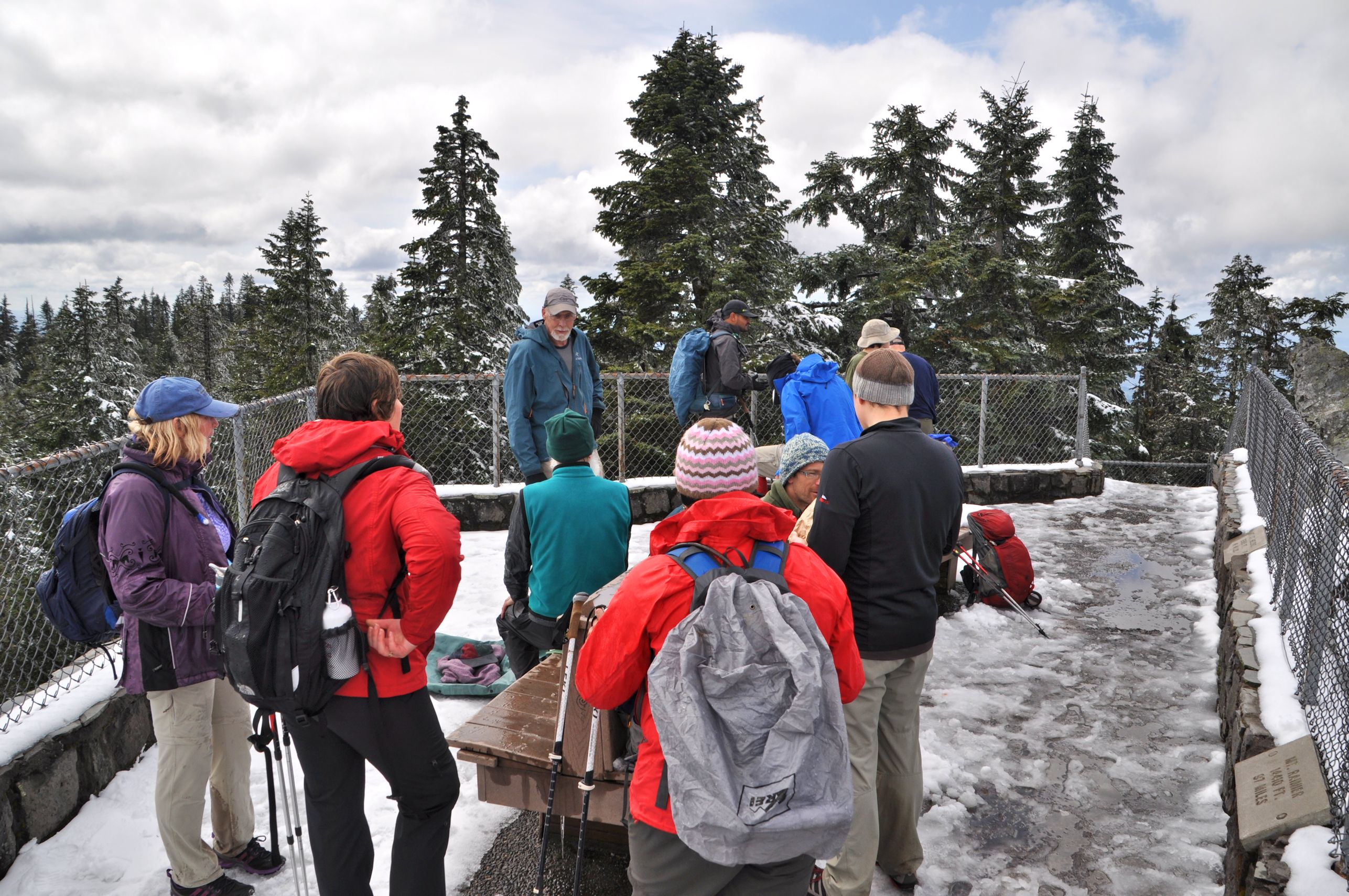 The summit was worth it! A lovely little rest spot has been built right at the top of the mountain, with benches and a fence to keep us from tumbling over the side. We gathered with other tenacious hikers and ate lunch. The sun had melted the snow off the tops of the benches, where we were able to sit. There was very little wind to speak of, but it did get a bit chilly when we stopped moving.