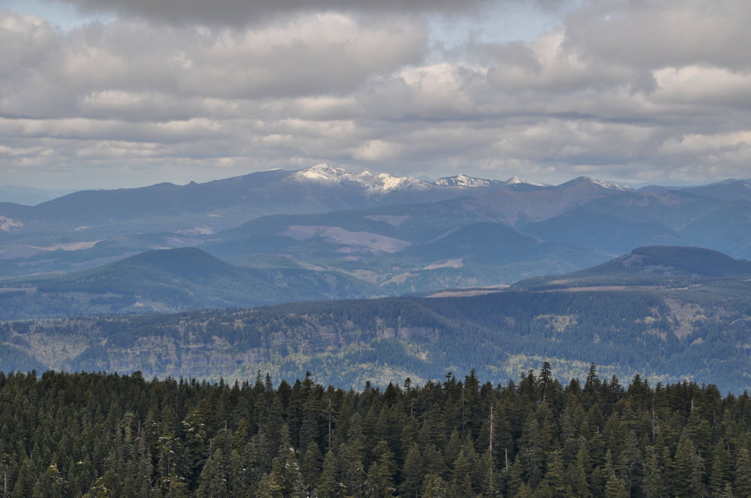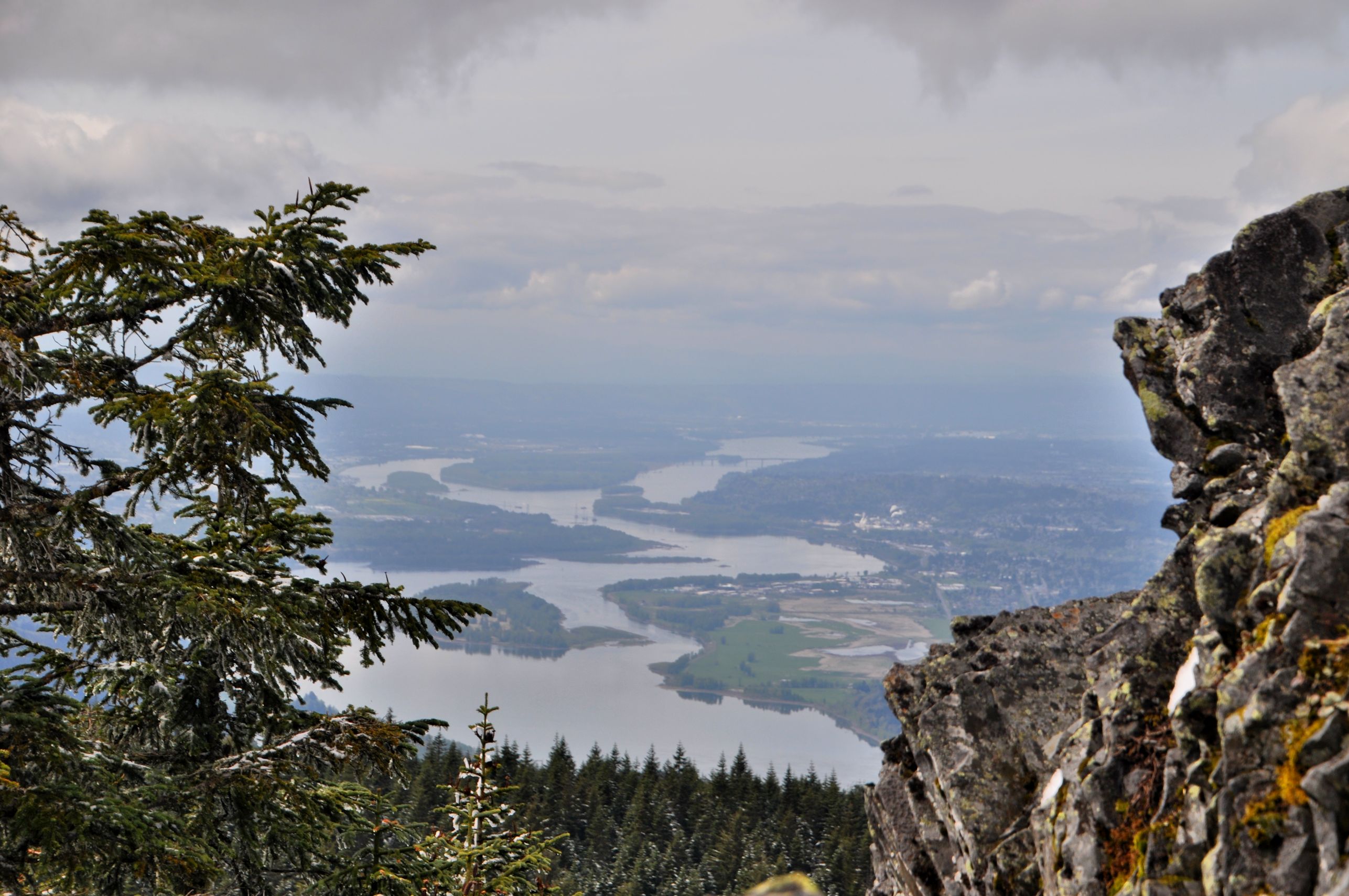 Sadly, the clouds had been gathering all morning, so by the time we arrived, all the volcanoes were obscured. Remember my view from Tom, Dick and Harry Mountain? On a clear day, the same views can be seen from Larch Mountain. Though the volcanoes (St. Helens, Rainier, Adams, Hood, and Jefferson) were hidden, we had a great view of the valleys around us, including the Columbia River.