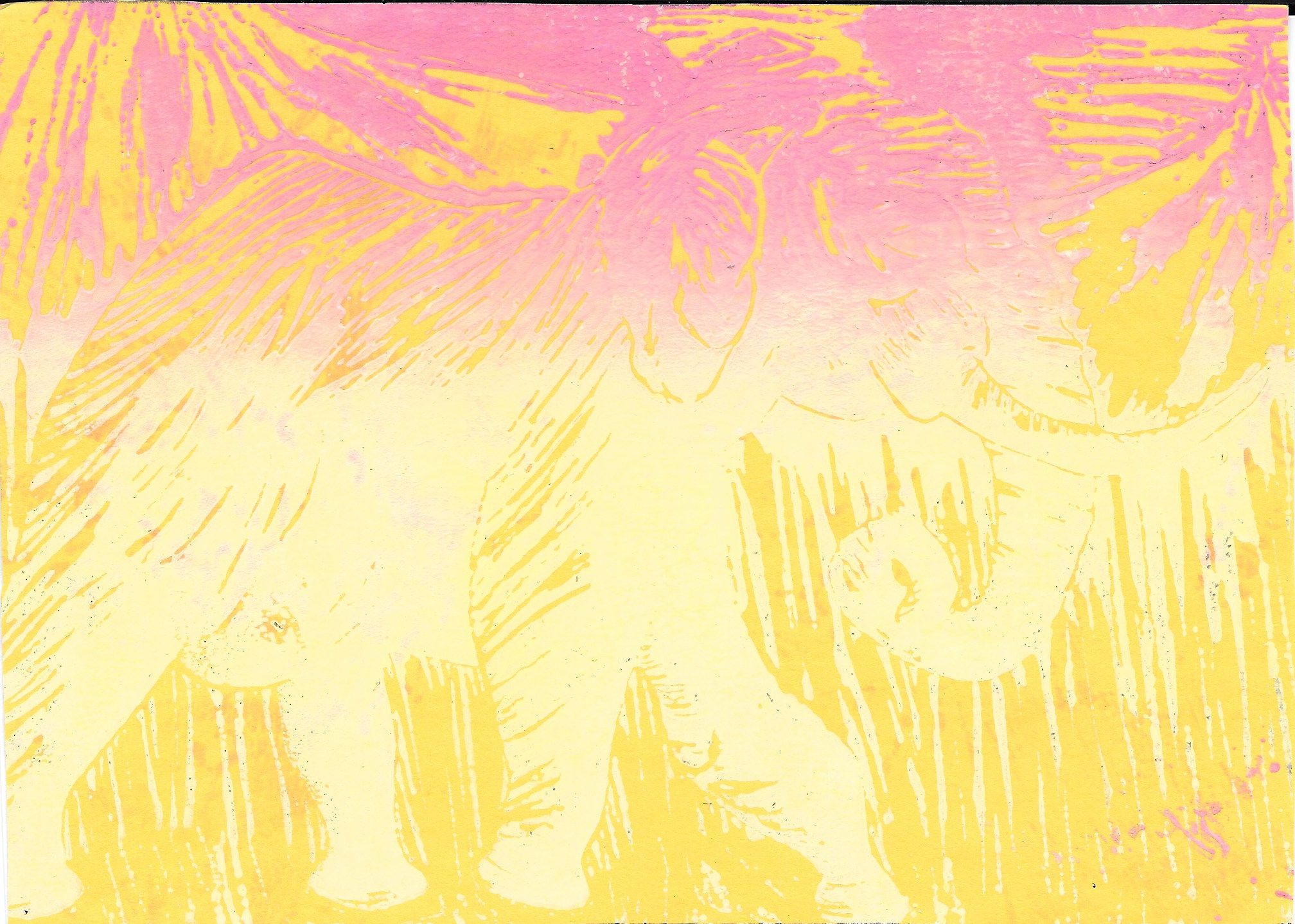 Drawing is slow work. Luckily, Tara already had a bunch of elephant block prints from last year’s art class. I aboslutely love this elephant. You’ve seen it previously, on my Good Things Jar (where it remains, of course). There were several other versions of the same elephant in Tara’s art folder, so they cut them up and pasted them to handmade cards.