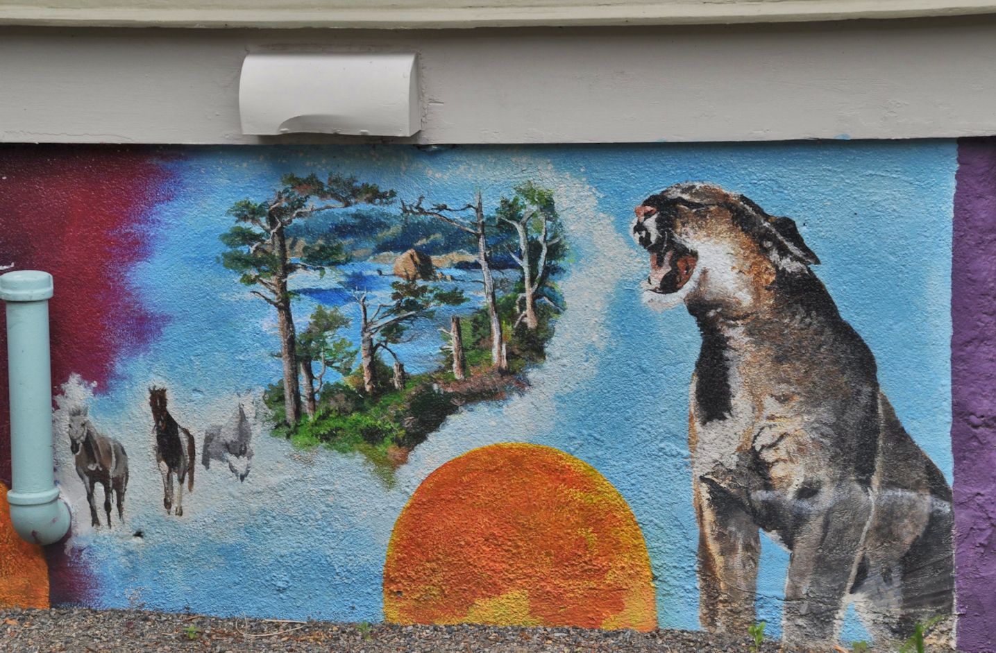 This one is tiny: perhaps 2 1/2 feet tall. It includes a micro-mural of Haystack Rock, on the Oregon Coast, shown in a recent post.