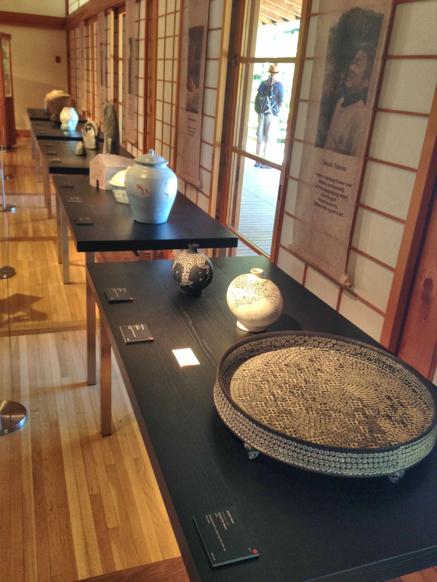 Inside the pavilion, events are held. It was a bonsai exhibit in my “rainy” post. This time a pottery exhibit. Most of the pottery displays were traditional, but this artist was fanciful.