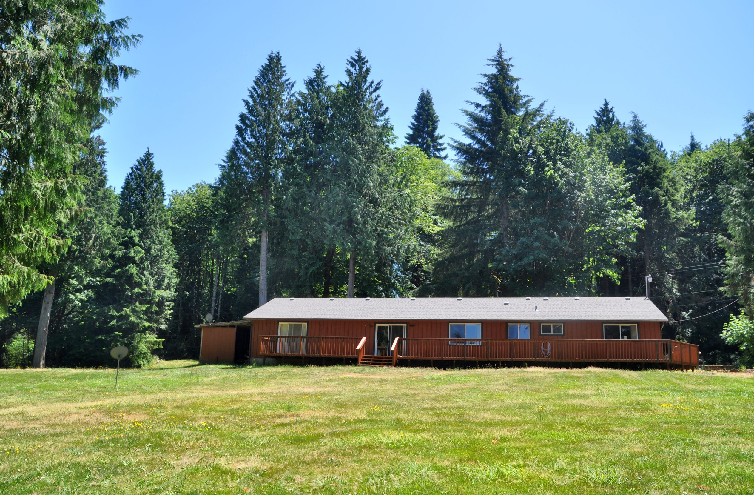I am standing beside the road that runs past the house. Creek on my right, and the Jeep on my left, backed up to the door for unloading.A year-round creek has trout and crawdads.The pond hosts a painted turtle who likes to sun himself on the tiny island. It’s also stocked with Perch, Bluegill, and Smallmouthed Bass. The man who sold the place to me said he only fished with his grandsons and they caught and released. I plan to eat what I catch! Yummy!This is behind the pond, a park-like area that holds a few Wood Duck boxes on the trees.Standing beside the pond, looking up at the house on the hill.The back of the house, with the long deck. I expect to spend many days on that deck. Don’t you think it needs a couple of trees?