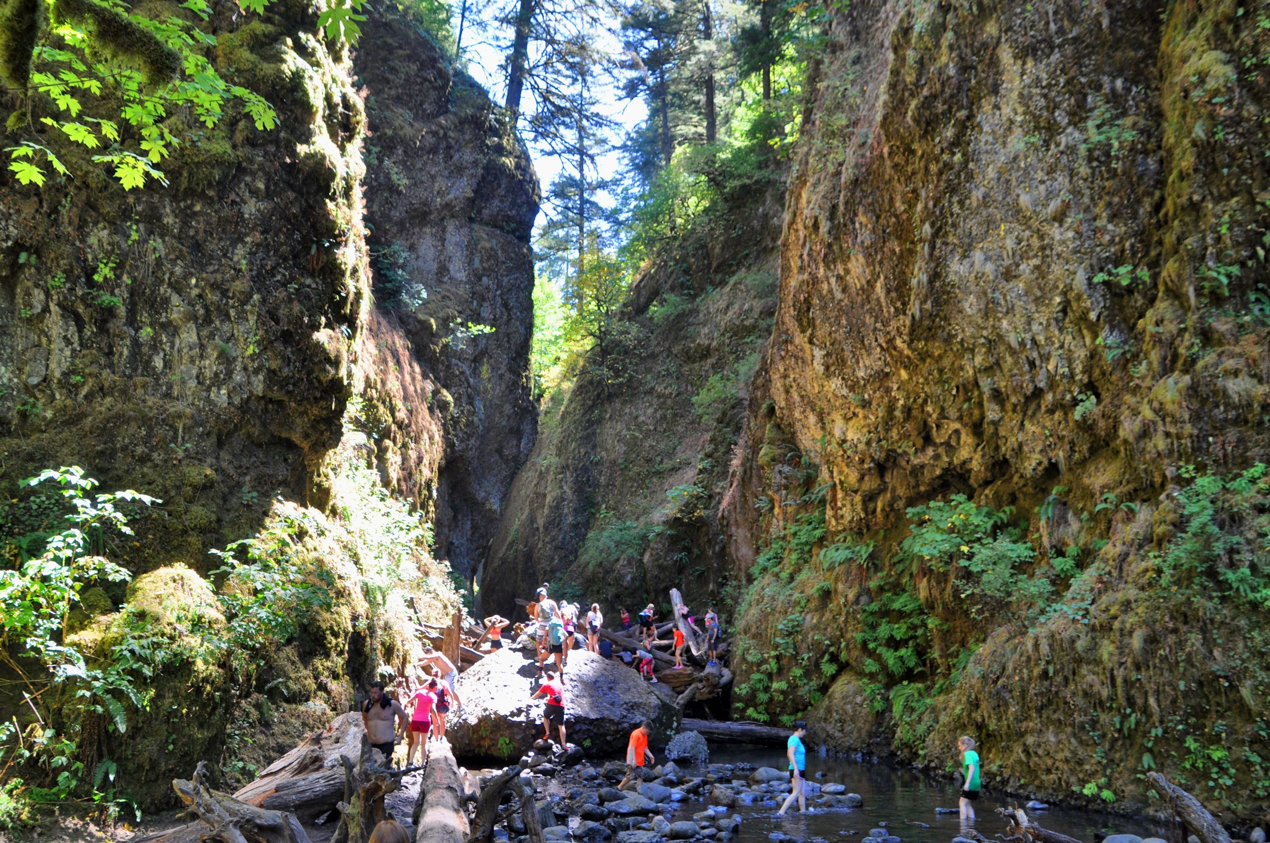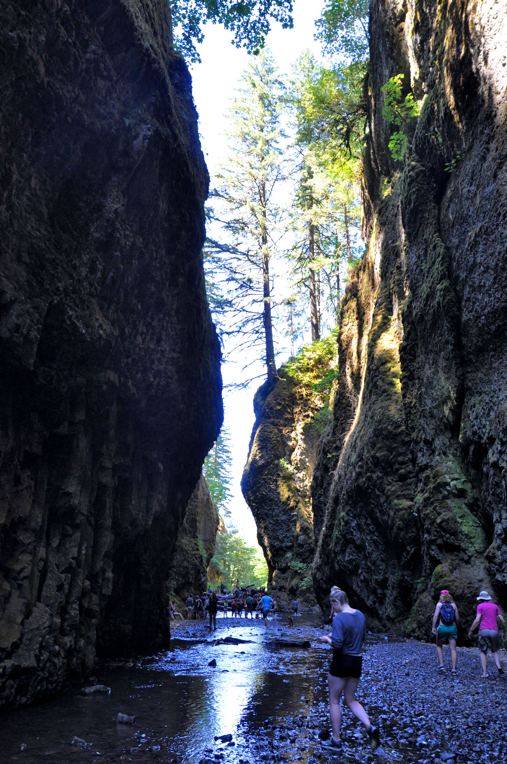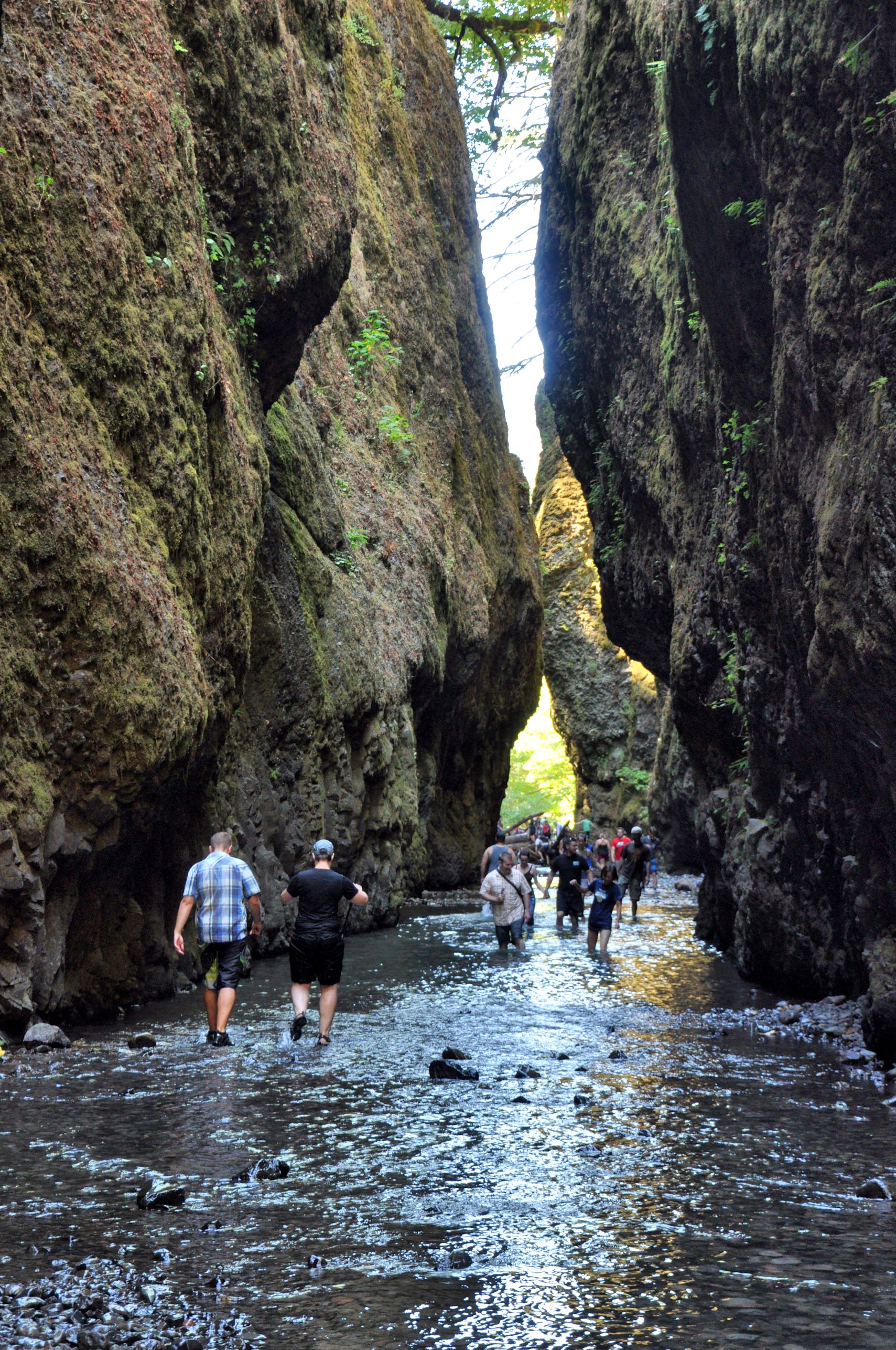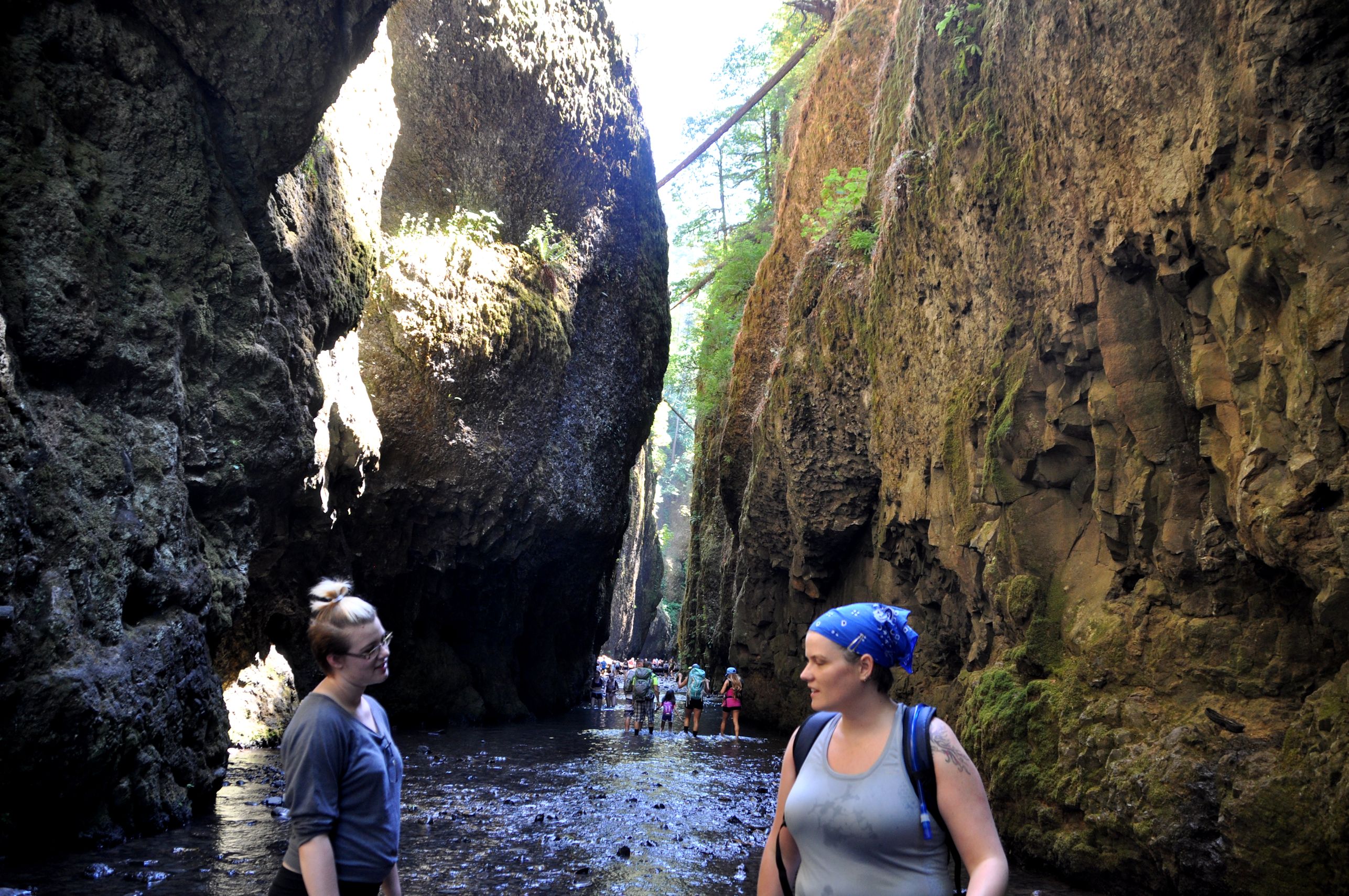 The trailhead is just off the I-84 east of Portland, only 40 minutes from G’s house (and the Blue House where Tara and I used to live). We found parking along the Historic Columbia River Highway, in the shade! It was a short walk past multiple trailheads that leave from the Oneonta Gorge area. There are no signs alerting us to the beginning of the Oneonta Falls trail, but we are clever people and realized that since the trail is the creek, we would just walk into the creek and head upstream.