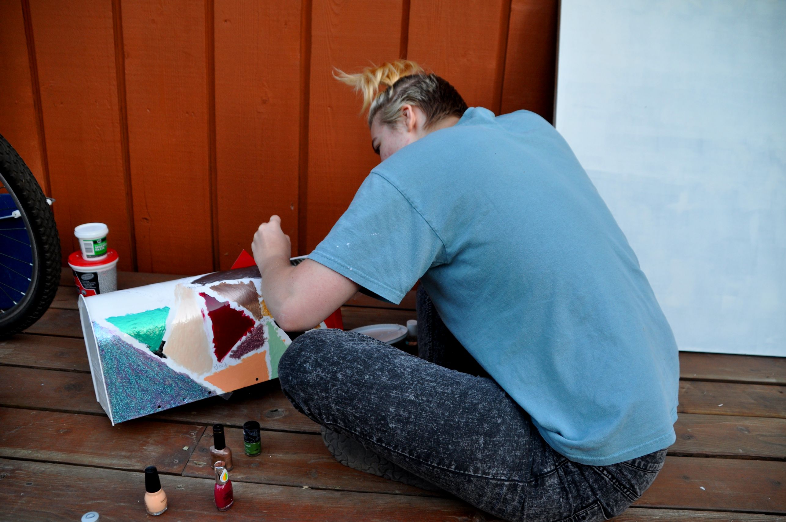 I don’t know whose idea it was, but we loved the idea of painting it with old, clumped and gummy nail polish. Looks terrible on nails, but it could look great on a mailbox. We’ve been collecting nail polish for years. A lot of years. Some of it was gross. But perfect for this project.
