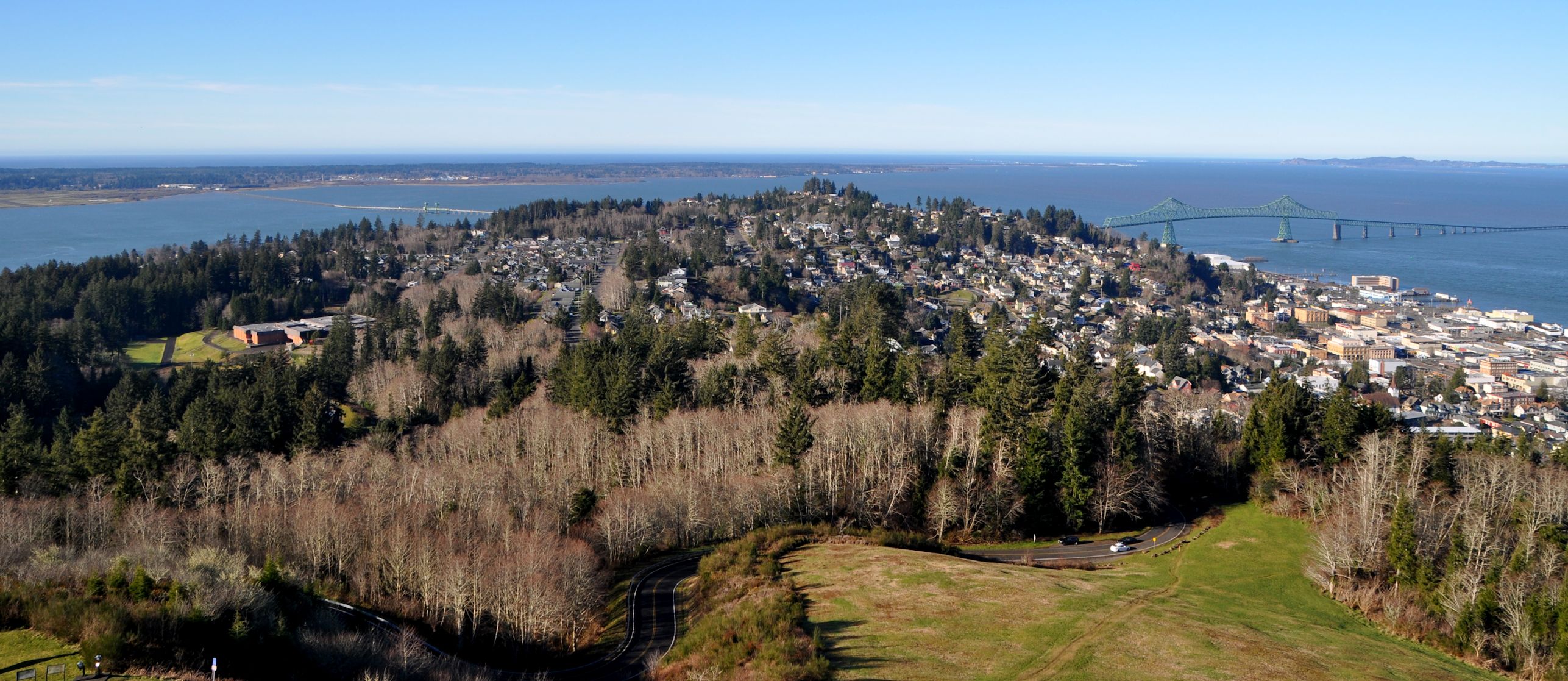 A view of the city of Astoria from the column. Columbia River on the right, Youngs Bay Bridge across Youngs Bay to the left, and the Pacific Ocean in the distance.