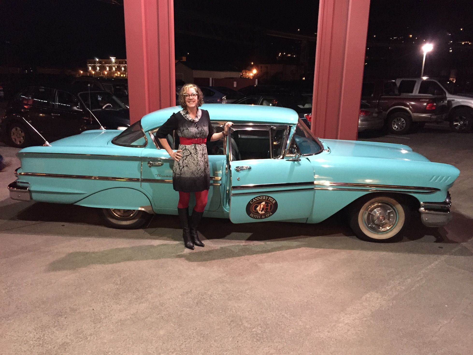 First of all I’ll tell you about my night. I was not very hungry after eating gouda cubes and smoked salmon on crackers with complimentary Chardonnay, so I picked a place called Wet Dog Cafe & Brewery (there are a lot of breweries in Oregon), hoping for a tasty dessert. I arranged for a chauffer to take me there in one of the hotel’s three restored antique cars. I think he told me it’s a 1958 Chevrolet. My driver was a great guy who had been driving for the hotel for many years and probably would have been fun to ride around all night with, but in minutes he let me off. Once inside the Wet Dog, I was tempted by the marionberry cheesecake and since I was at a brewery, I had a pint of Bitter Bitch, because, who could resist with a name like that?