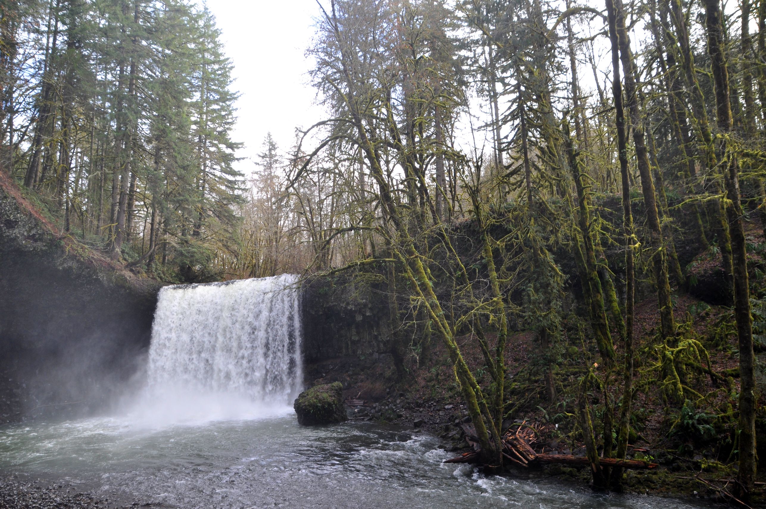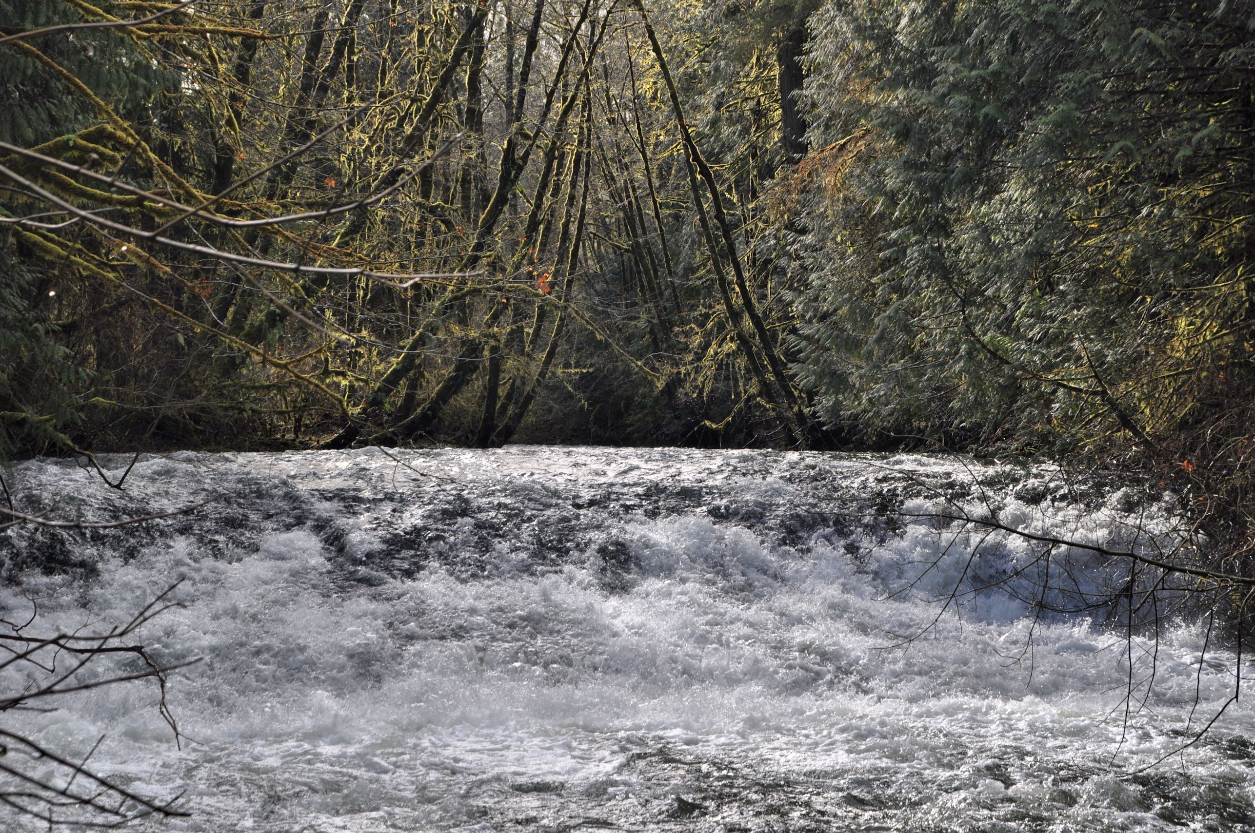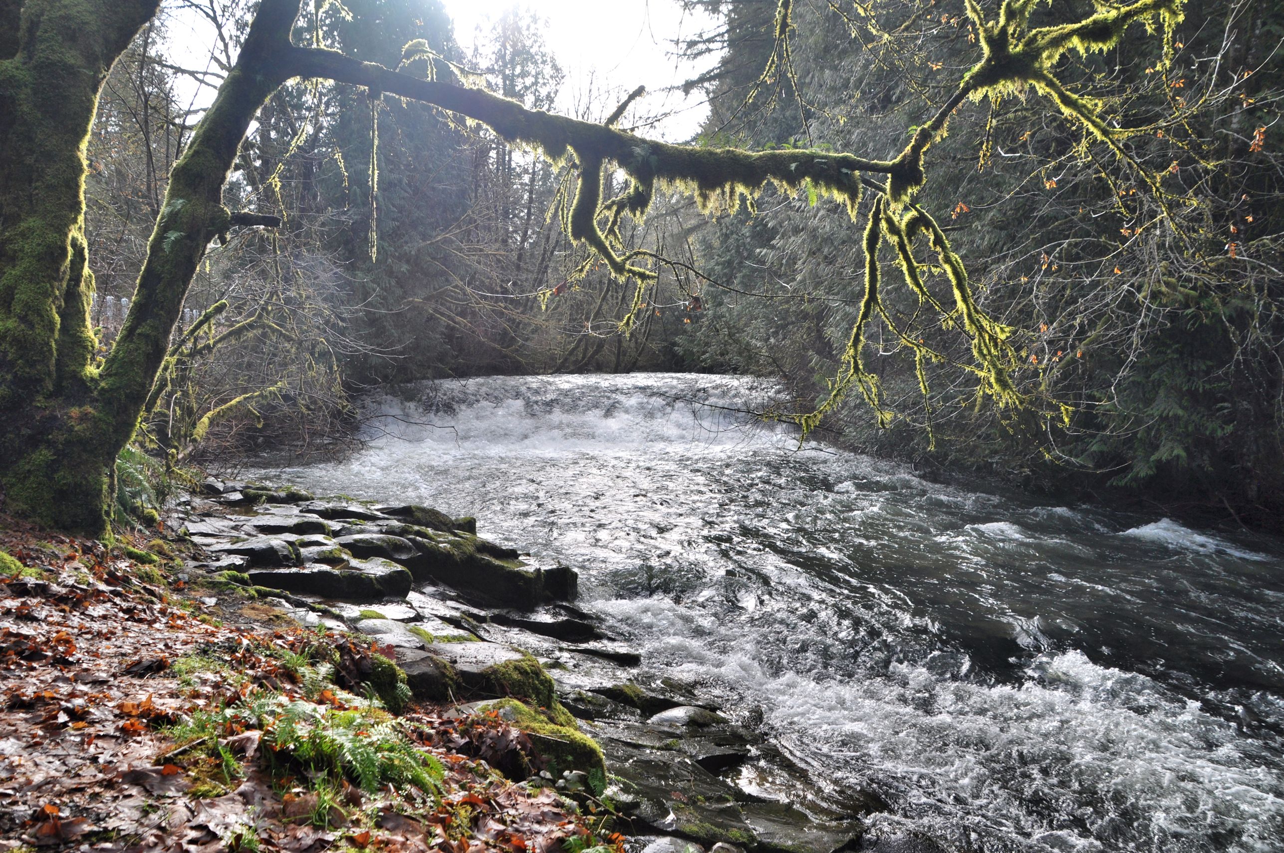 Before we got to the creek, there was a pull out on the road, where we pulled out and went to the water’s edge to watch the water roaring over a couple of short falls. The sun had broken through the morning fog and lit up a white fence along the highway, and I took the shot at the top of this post. Then I went over the bank and stood there soaking it up. A rainbow lit up the spray to my right. Huge basalt columns formed the banks of the river to my left. We climbed around and guessed at the height of the water during the December floods, as thick mosses on the tree branches above us caught fire in the sunlight.