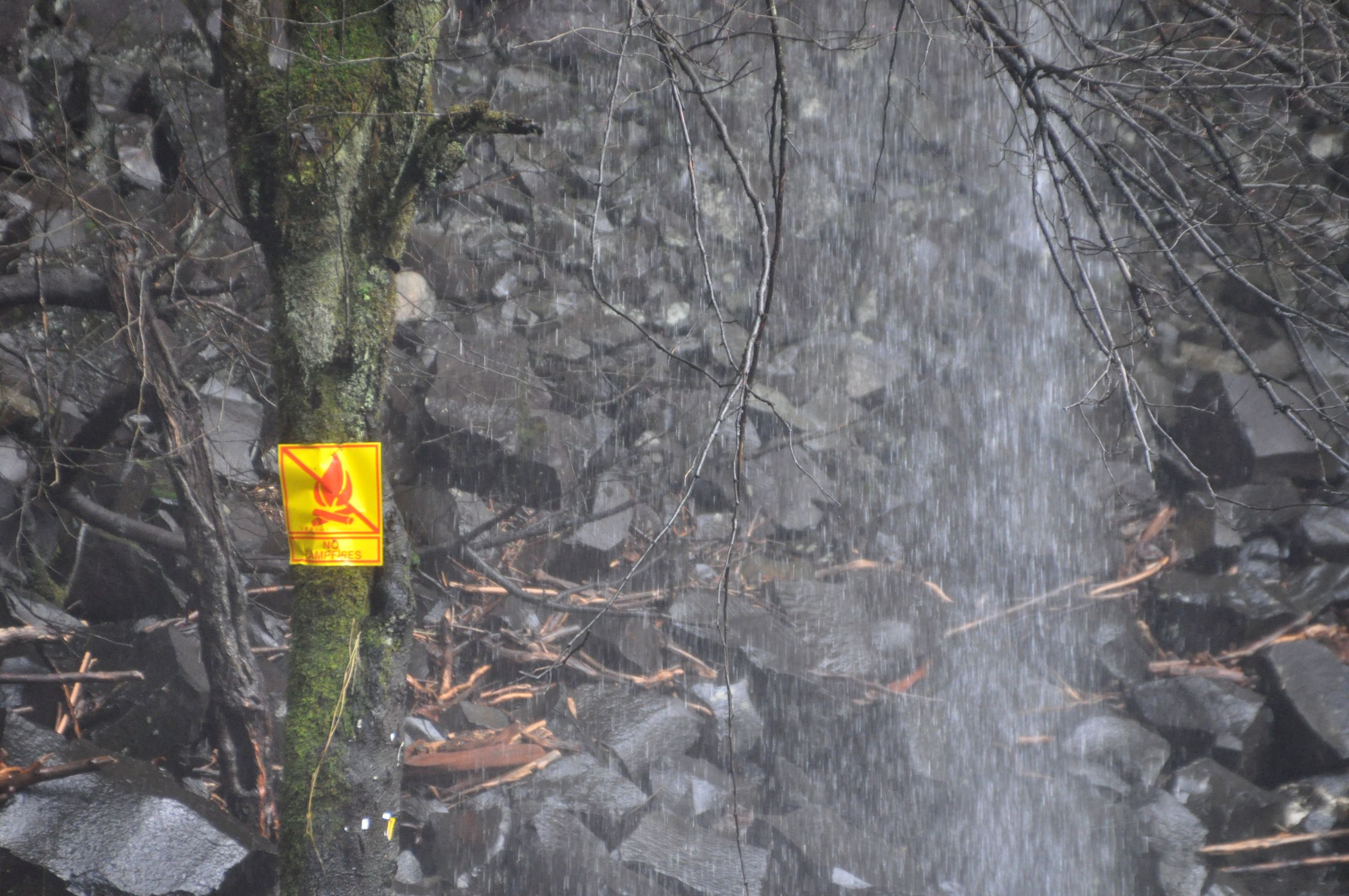 This last photo is for laughs. The sign, drenched in a waterfall and nailed to a tree with its roots in the water, warns NO CAMPFIRES! Darn it, I was just looking for my matches…