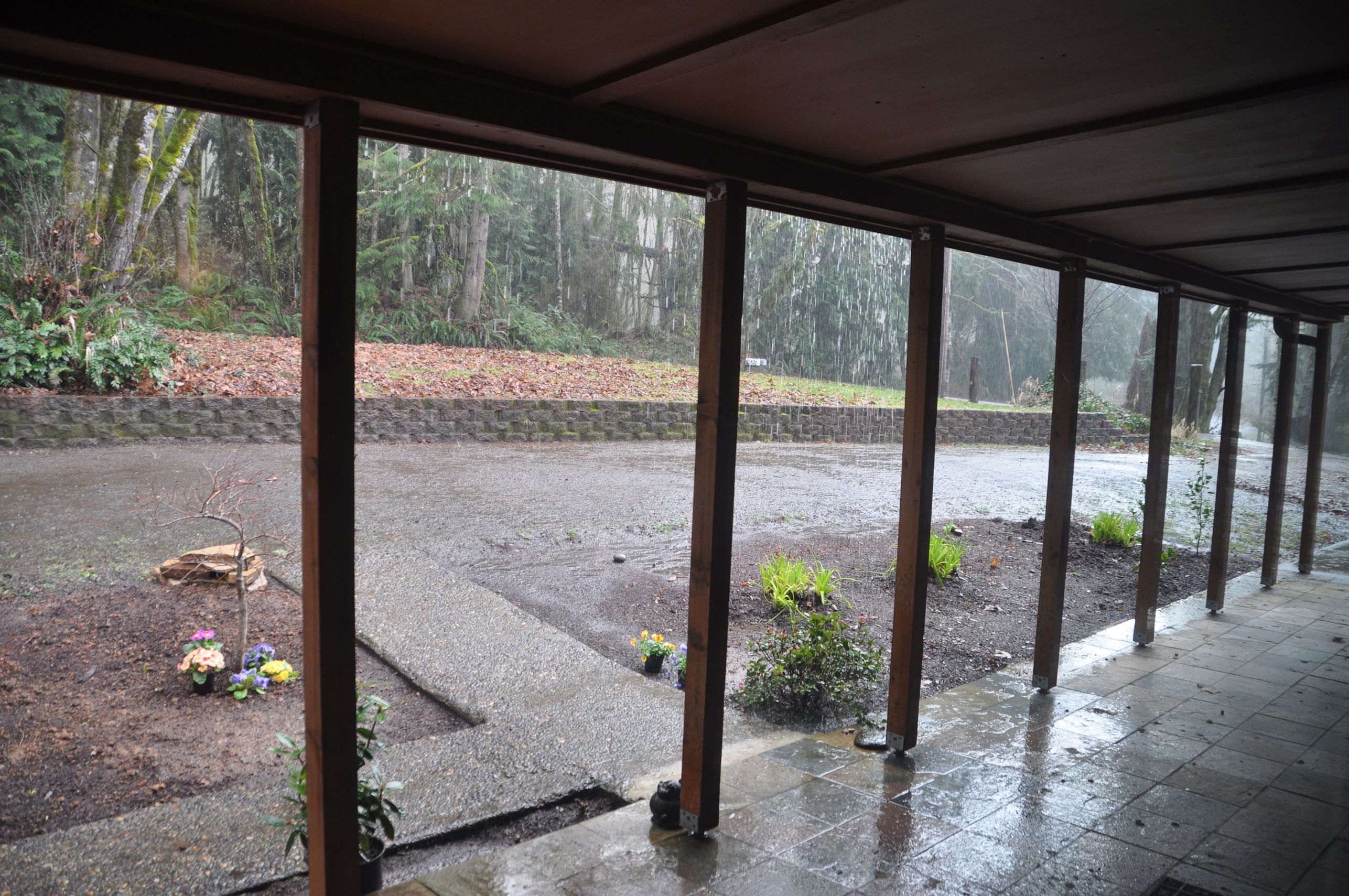 The rain was gushing today, but the ample front porch keeps the front of the house dry.