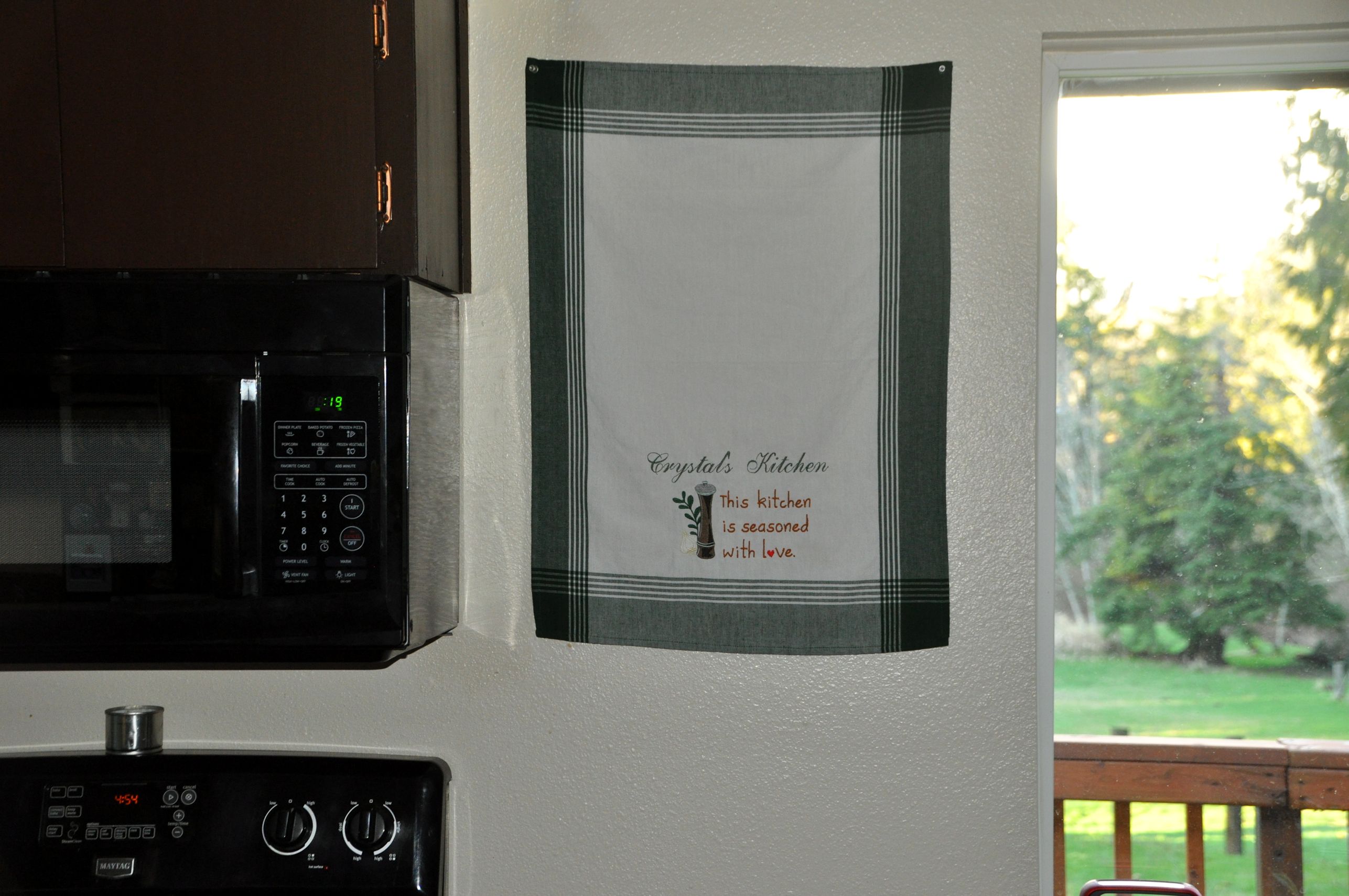 Close up of the kitchen towel that Marlene made for me as a housewarming gift.