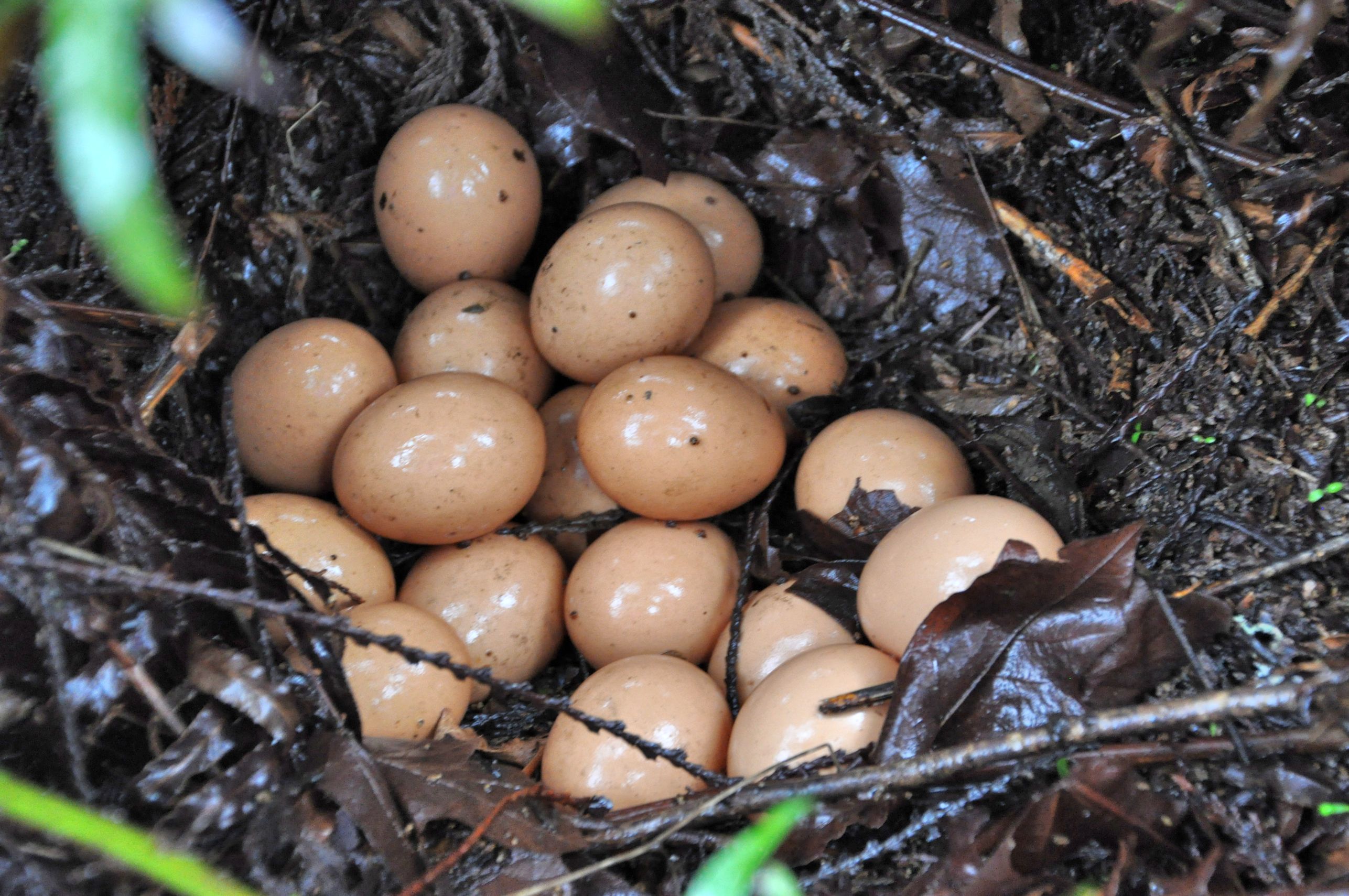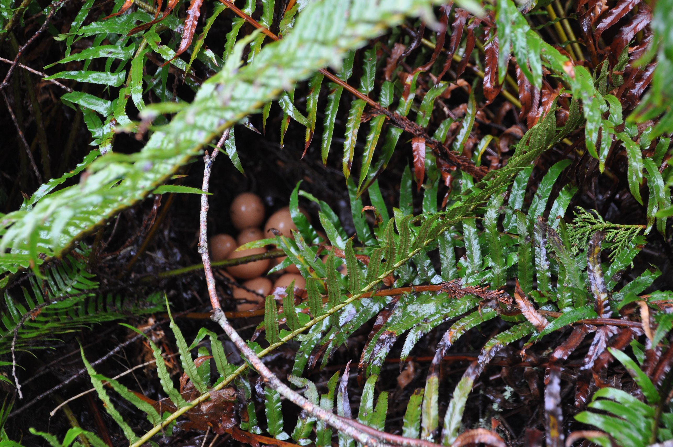 I walked closer and got a new view. Something pale-coloured beneath the ferns. Something light in the dark. I bent down and spotted the motherlode of eggs! There were NINETEEN eggs piled up! Carefully tucked into a nest of decaying pine needles and ferns, was a pile of eggs, laid one at a time in patient confidence. It looked like a turtle nest. I was so excited I was hopping around with glee.