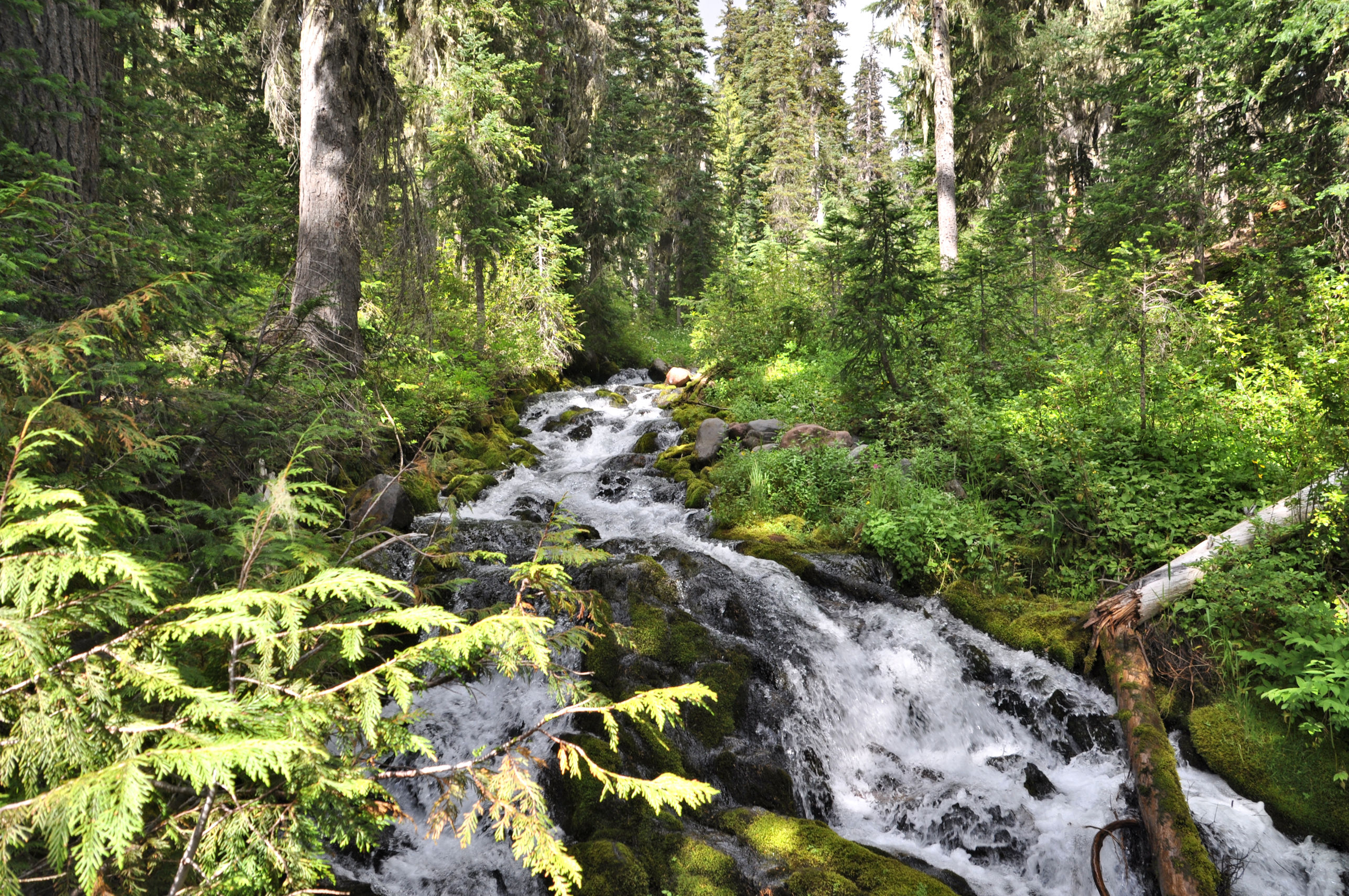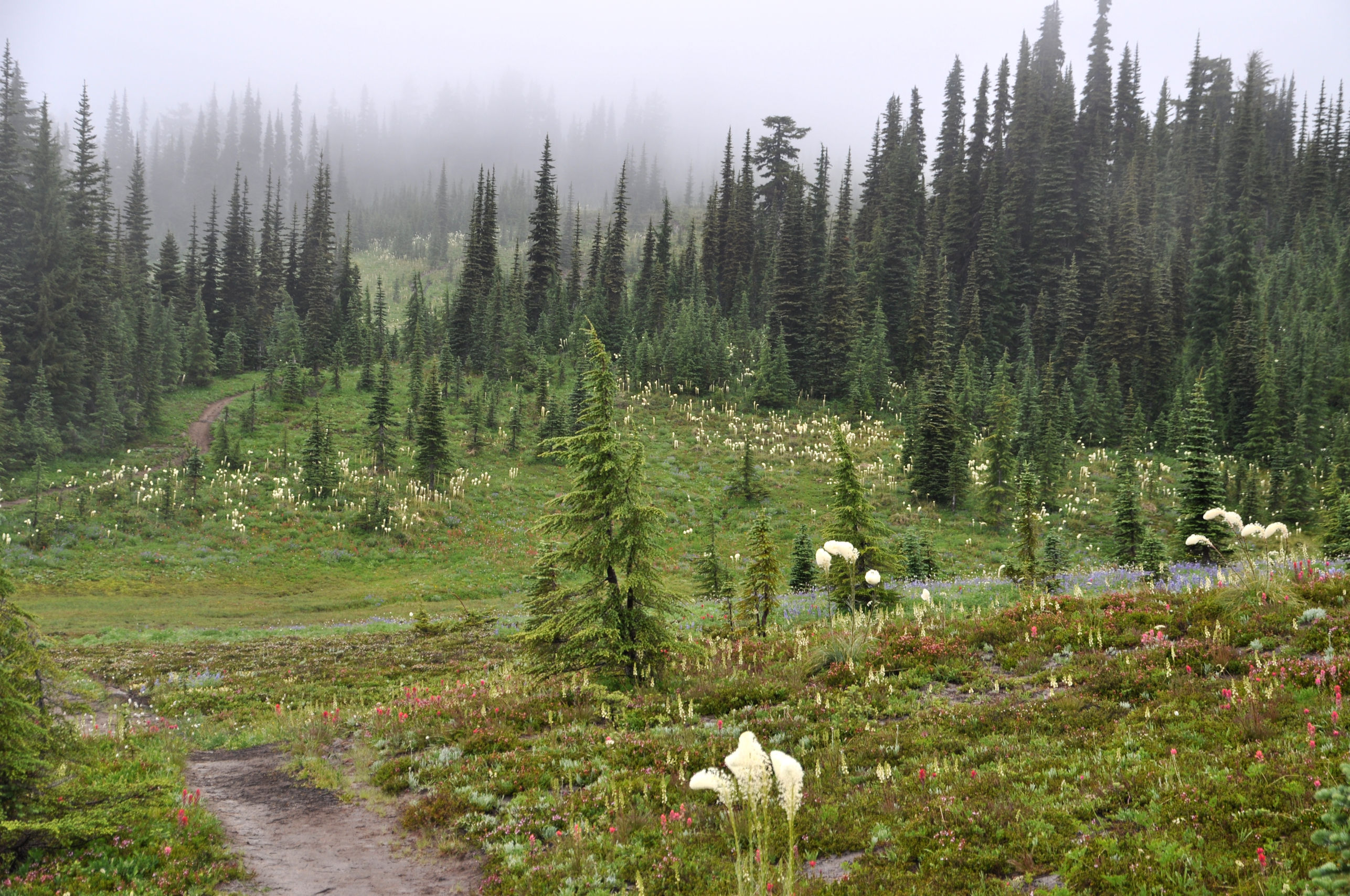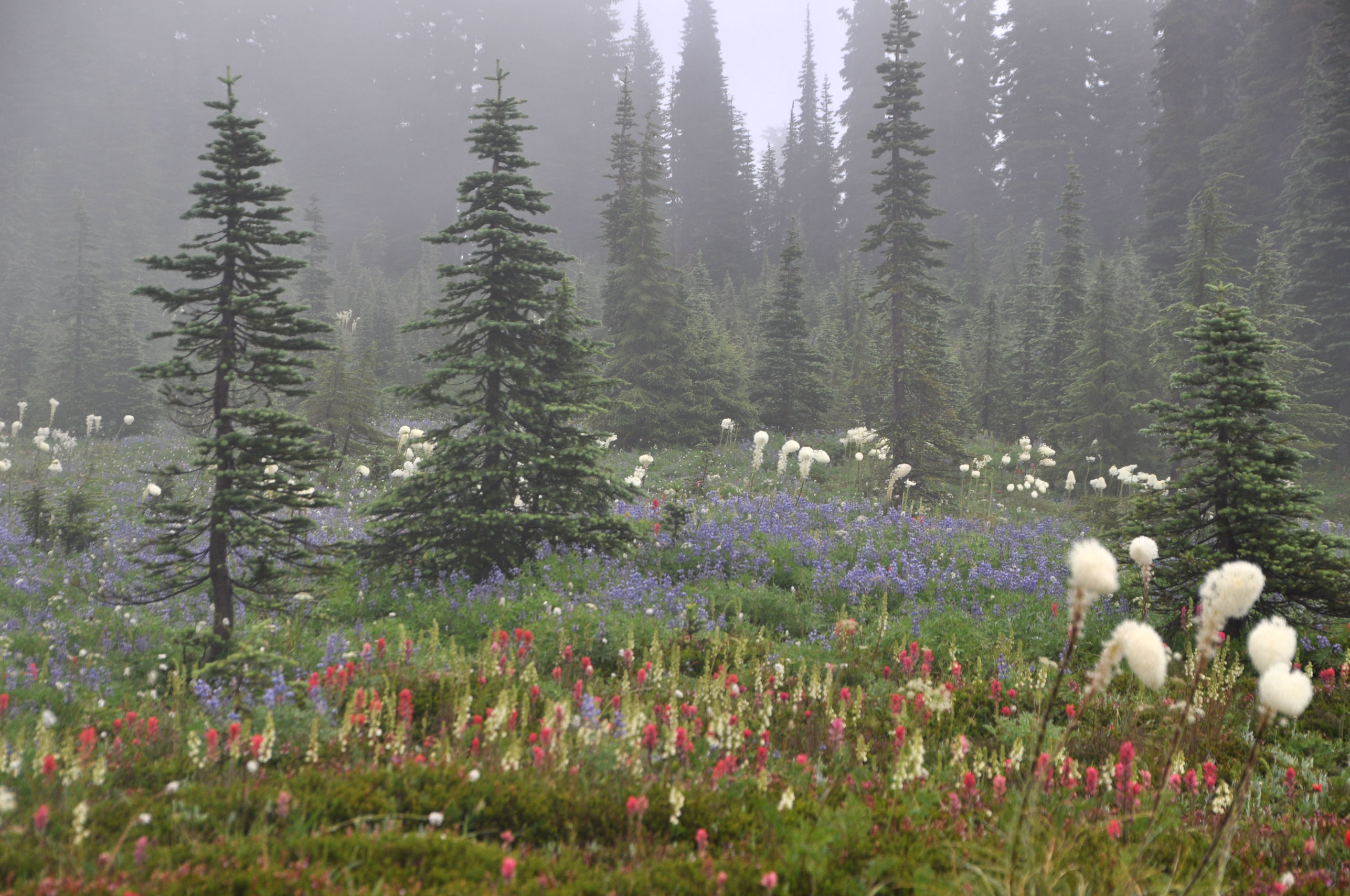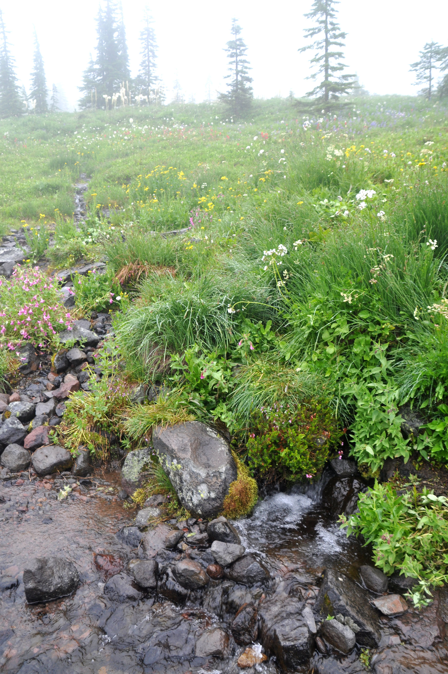 We wandered through meadows and found scene after scene of astonishingly beautiful wildflowers in full view despite the fog. We discovered a huge spring where water literally bubbled up like a fountain, and in other places poured out of cracks in the earth. At the trail there was no creek, but twenty feet down the hill was a creek bigger than the one on my property. That’s how much water burst from the lush green hillside.