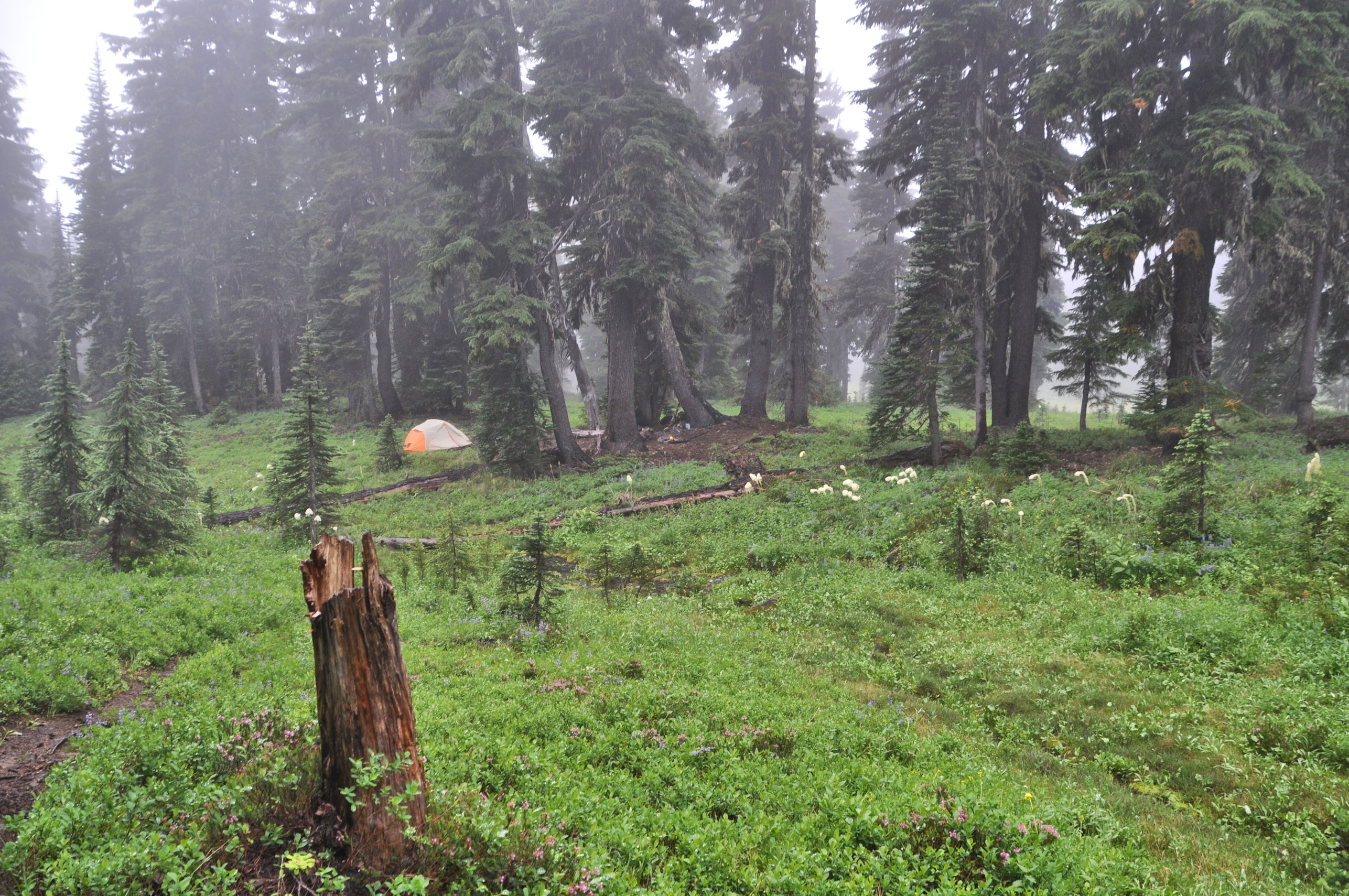 We didn’t stay out long, and were tempted to go back to camp where we could have a fire and get warm again. Upon our return, we found that other campers had vacated a great spot on the edge of a cliff. If we were there, even if the clouds only lifted for 2 minutes, I would get a little bit of a view. Hee hee. We moved our camp and had a new fire roaring in no time. Typically I try to avoid fires in the mountains in August. As you all know, wildfires are nothing to mess around with and I never want to tempt fate. But on this occasion, everything was soaked and I was supremely confident that the forest would not burn due to a flying ember.