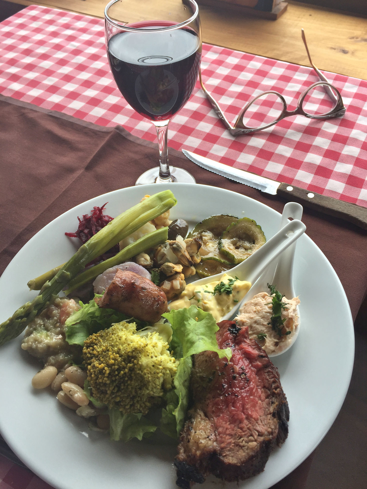 We stopped for lunch at a fabulous barbecue buffet, called Rancho Espantapajaros that had been recommended by Vicki. The meal was a bit pricey, but it was our only real expense of the day, so we were happy to pay for the wonderful meal and atmosphere. Our first view upon walking into the place was a twenty-foot-long spit turning over a fire, holding beef, chicken, and lamb. They also served sausages and wurst, cold potato salad, beet salad and sauerkraut, sticking with the regional theme. We sat beside a window with a view of the lake and some llamas and ate a bit of everything, including fresh water mussels and salmon ceviche. It was here that Margaret tried a dessert that turned out to be the Nalca I mentioned in yesterday’s post. We climbed into the trusty rental car that had taken us so far already, and continued south along the coast, with stunning views of wildflowers and rolling green hills.