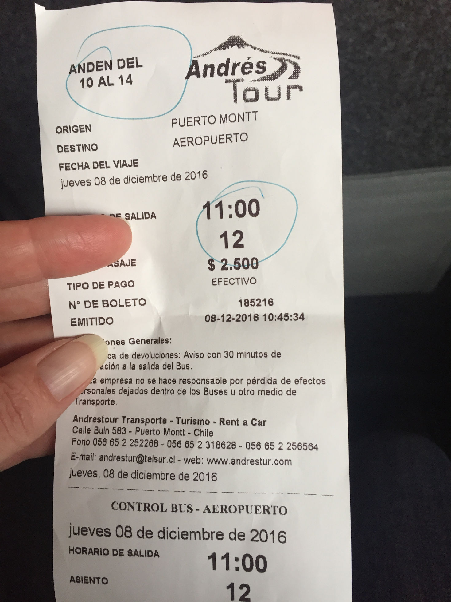 We had a hard time explaining where we wanted to go. “bus estación” was apparently not enough information. We tried and tried to get the message through, and finally Margaret said she was trying to get to Chiloé. The taxi driver immediately brightened up. “Ah, Chiloé?!” With total confidence he drove us half an hour into Puerto Montt, and out to a remote, industrial part of town. The minutes were ticking to get Margaret into place in her itinerary, and I was relieved to see a row of busses parked at this interesting and very very quiet building. We stopped, and the taxi driver checked in with us one more time “Vas a Chiloé?” and we replied yes. So he proudly gestured to the building. We paid and went inside, and our transportation drove away. Inside was quiet, and clean, and attendants stood in uniforms. What kind of bus station was this? We stood in line and watched the clock inch ahead. Margaret eventually absorbed enough visual cues to become convinced there was a problem. She showed her already-purchased bus ticket to one of the uniformed attendants, and he assured her that all was well and to get back in line. When we finally reached the counter, the woman looked at the ticket and said, “No, no, no. You have a ticket for the municipal bus line. This is a tour company.”
