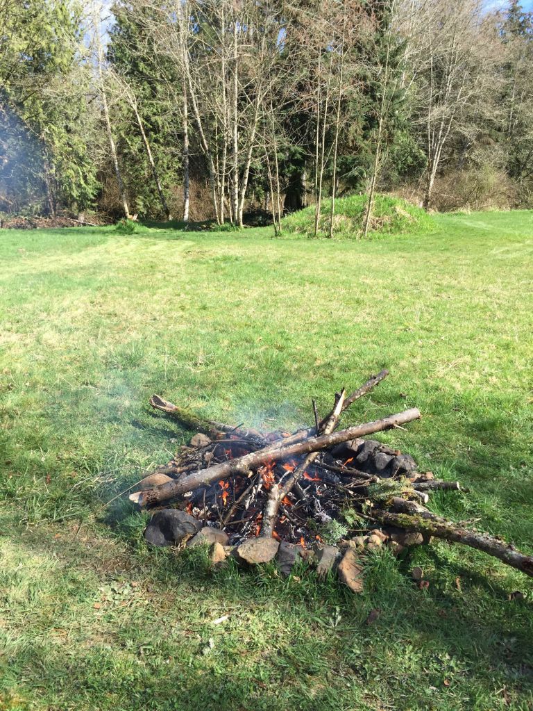 I’ve been cleaning up the land. Branches down everywhere, accumulated during the winter snows and rains and wind. I’ve been hauling them into piles and setting them alight. It’s a tricky thing to slog through the mud to a pile of wet wood in the rain and set it all ablaze, and I have gradually begun to perfect the art. And…very little chance of wildfire… so there’s that! 🙂