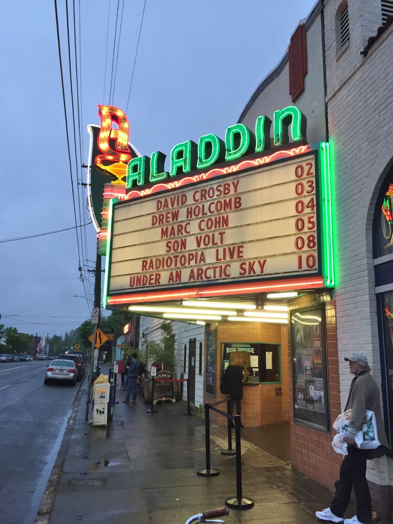 I’m not actually a Crosby fan, though his music is good. My favourite musician of all, Marcus Eaton, is also a dear friend of mine. Marcus toured with Crozby for his last album, CROZ, and so…I don’t know…I guess an affinity came of that. David Crosby has been making music – good music – for so many decades that I can’t deny his skill and relevance. And I had never seen him before in concert, or even Crosby, Stills, and Nash. (I did see Steven Stills play halftime at a Colorado Rockies game, but I digress…) And finally, his show would be at the Aladdin Theatre in Portland. It’s a venue that can’t be beat if you’re looking for intimacy and atmosphere.