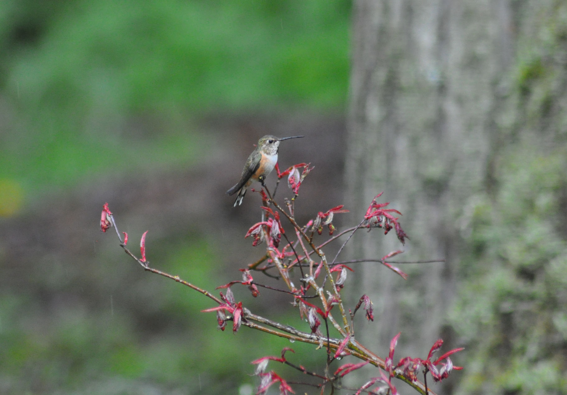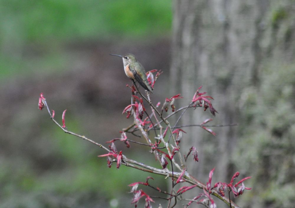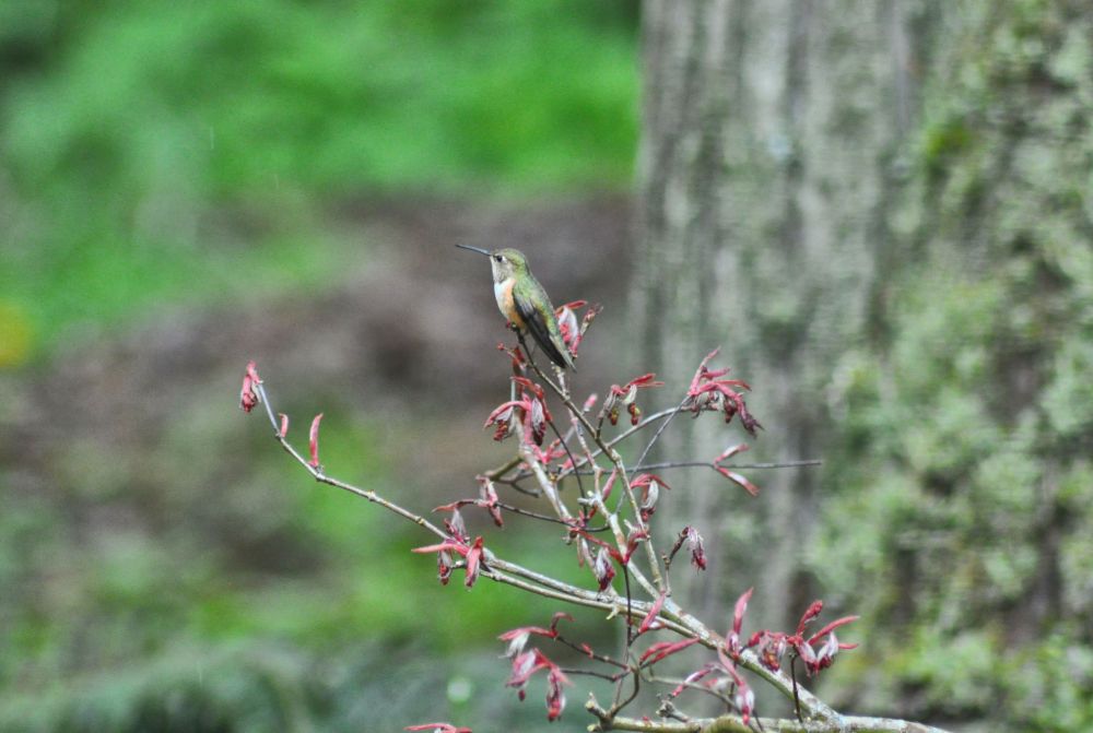 They barrel around the big trunk of the tree that holds their feeder, always avoiding collision with each other, though sometimes only by millimeters. They perch on small branches nearby and guard the feeder, chasing off any other hummingbirds that try to sip. But sometimes I’ve seen three at a time, resting on the wire ring and taking leisurely sips every so often. One of their favourite places to sit is upon the Japanese maple that you see above. They sit there for a minute at a time, looking around, occasionally buzzing their wings.