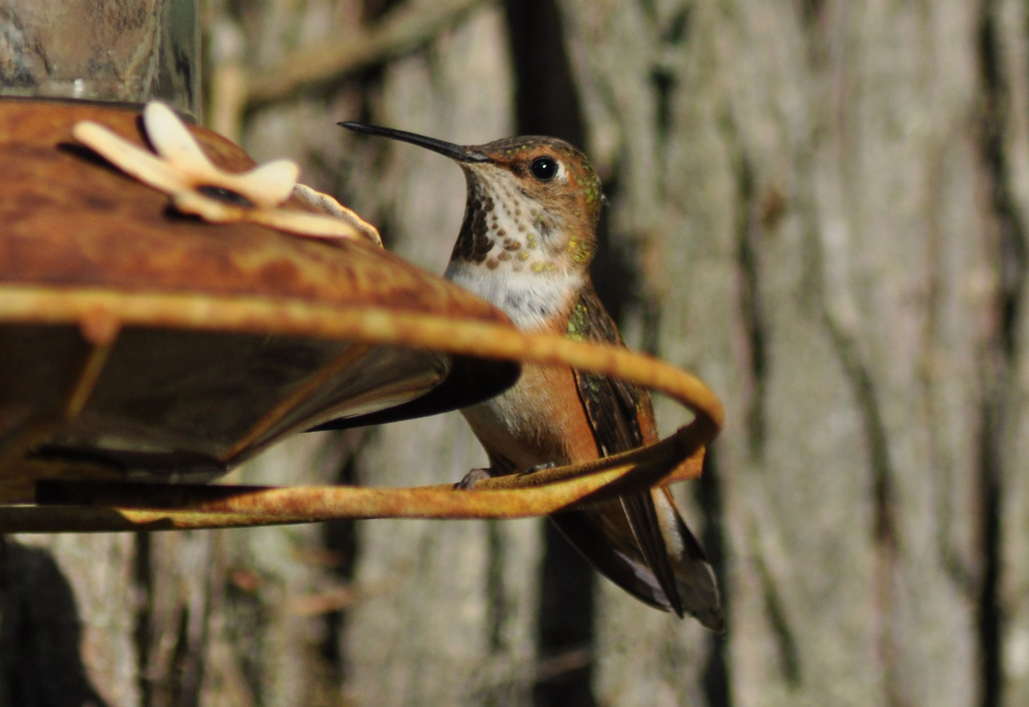 This hummer is coppery rust-coloured, just like the feeder.