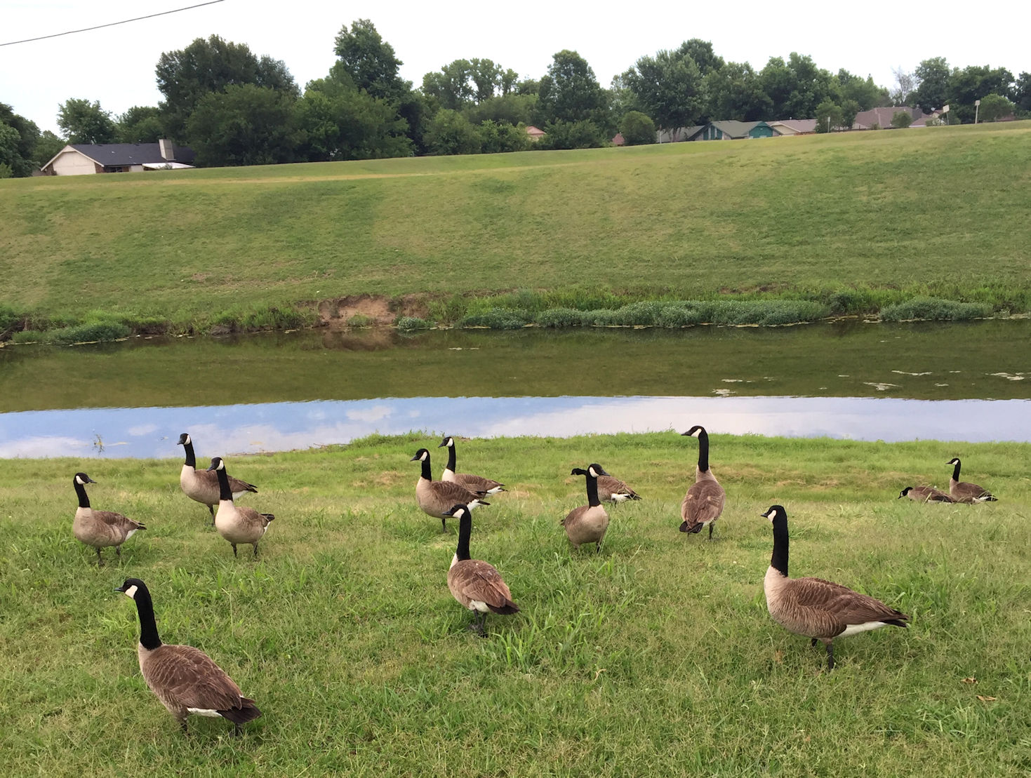 Stuck for hours in a slow part of Tulsa with no car, I went for a walk and stumbled quite unexpectedly upon a path beside Mingo Creek that begins about two blocks from my hotel. I followed the path, sharing it with a fisherman, some joggers, some dog walkers, some kids, and eventually came to a park. I explored the park, then wandered back, admiring the homes that some people are lucky enough to have right on the edge of this green space. The entire walk was through green grassy fields with huge trees all around me. I found birds and a turtle!