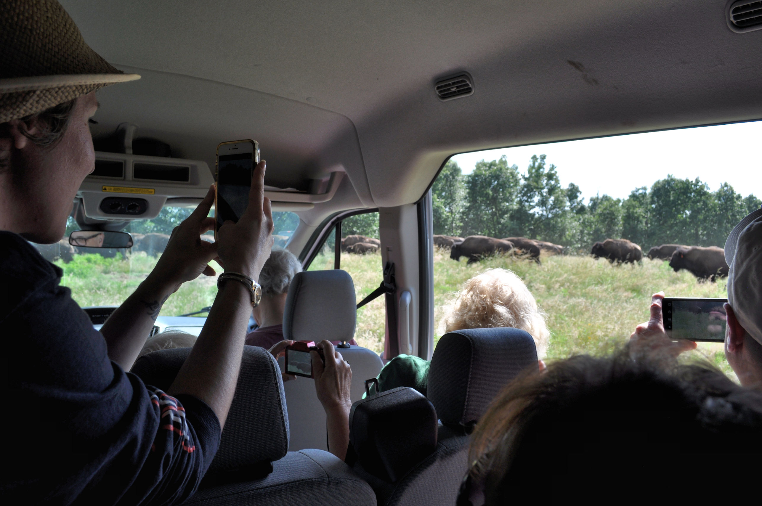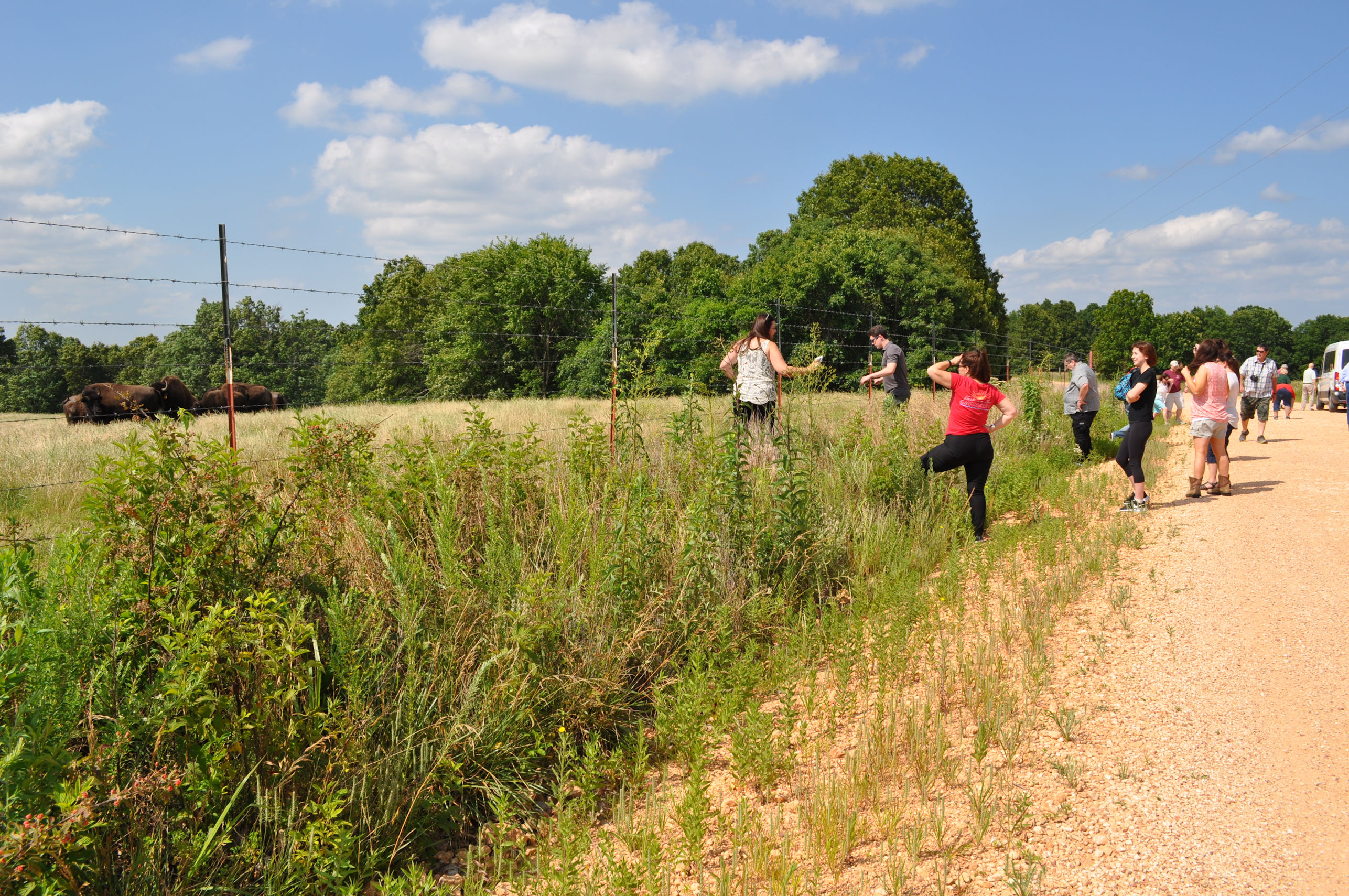 On our way to the caretaker buildings, we spotted them from the road. The vans stopped and people exploded out into the gravel road with glee, stepping through thistles and nettles and cockleburs to lean up against the barbed wire fence to snap shots. The buffalo ignored us and we soon moved on.