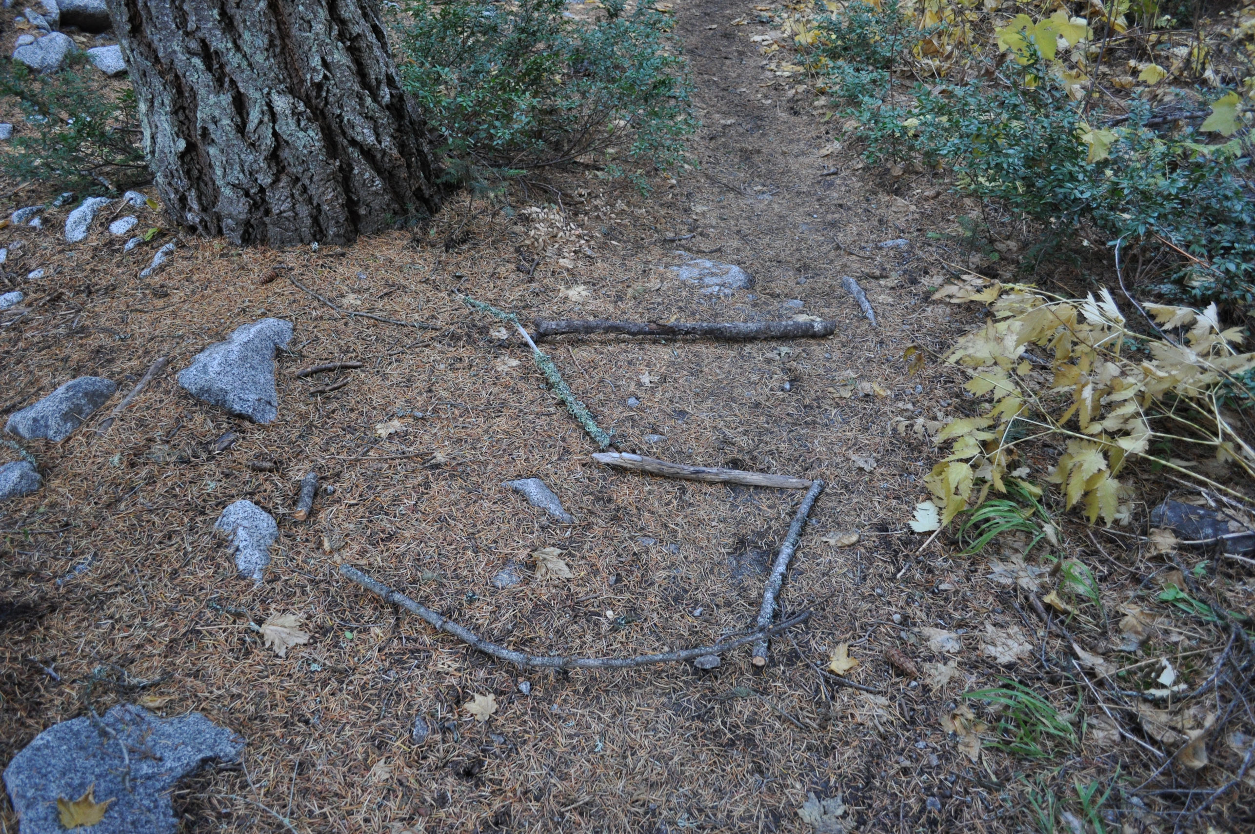 At one point as I was about to step over a pile of bark from a tree that had fallen over the trail, I noticed that some of the pieces of bark had been shaped into an arc. Only the curve was sideways, making it look like the letter “C.” And I laughed out loud. Yes, that is something he would do: leave me a message to let me know I was not forgotten. What a sweet gesture. It kept me going for another 15 minutes and then I was just about to despair in pain again, but I came across more bark that was indisputably an “R.” And that time I really laughed! That crazy guy was going to spell my whole name! Sure enough, 20 minutes later I found a “Y.” And it wasn’t until “S” that I finally had the sense to take a photo.