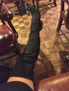 Karen studied for school while Ian and I talked, then she and I went shopping. I’ve been wanting black boots for over a year. I have beautiful brown boots that have lasted for years because I spent the money to get high quality. It was time to do the same for black boots. Because when you need black boots, brown boots just won’t do! Can I get an Amen! Anyhoo, while the super helpful assistant was in the back, searching for what was available in my size, Karen and I browsed a little too far into the section for boots-you-would-buy-if-it-was-your-birthday-and-you-felt-like-splurging. Oops. When the assistant showed up with an armload of boots suitable for the office, I had to send her away for one more box. I left with two pairs of boots, one of them was thigh-high, velvet, high-heeled, and sexy as hell. Take THAT 48 years old!