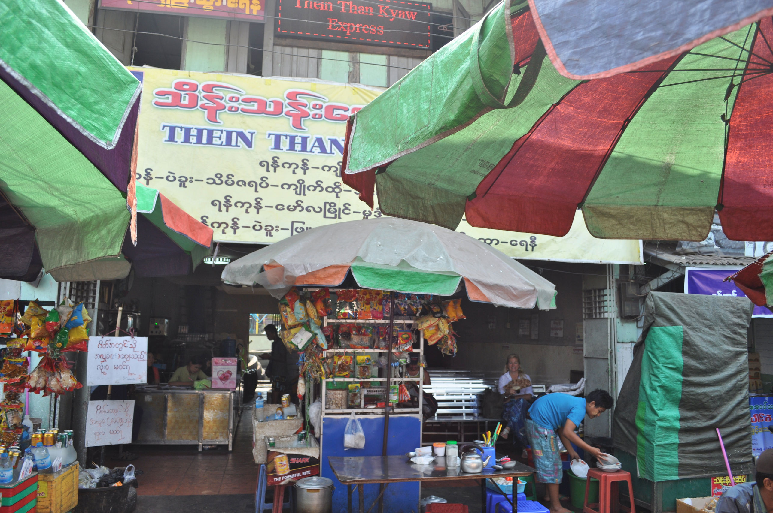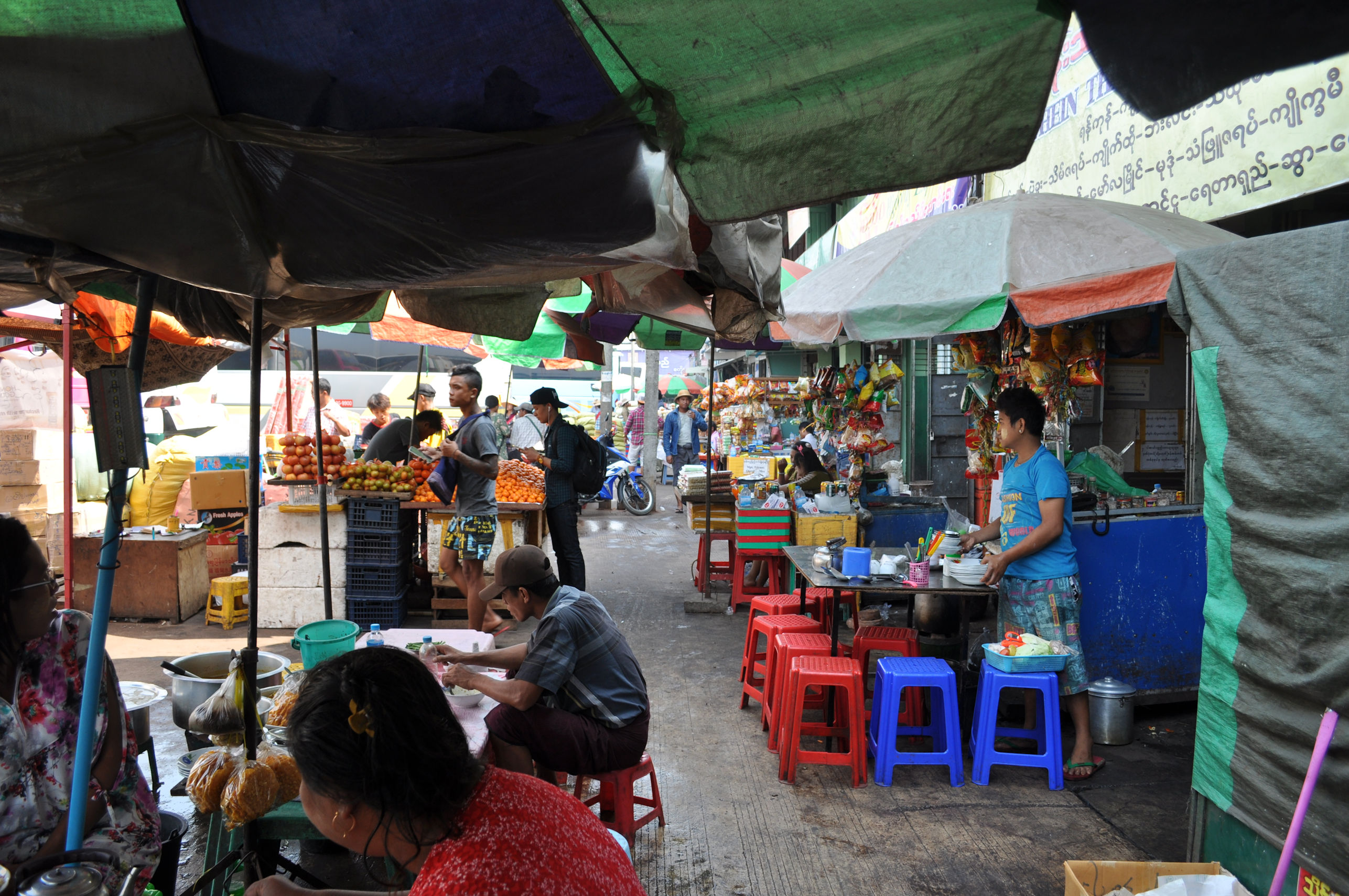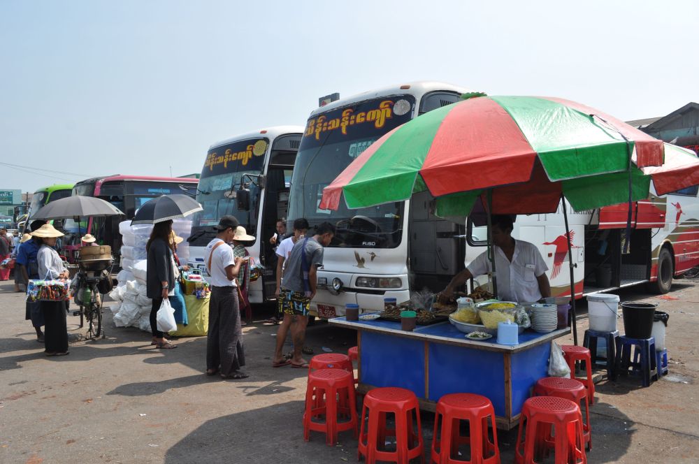 Thus, we arrived at our bus station with over two hours to kill. This is the craziest bus station I have ever seen, and Iβm guessing it will hold that top spot for years. It looks as though many bus companies all have their offices side by side in a big square, all facing the center. As we had already seen in Yangon, vendors set up their stalls anywhere people might walk, which is an excellent business plan you have to admit. People walk through, busses occasionally drive through, honking to warn the people to get out of the way. So imagine a giant βUβ of shop fronts that belong to a menagerie of bus companies. Then imagine a bus parked in front of them all, making a smaller U. And out at the front of the busses are some vendors, but between the busses and the buildings is a regular market. There are kiosks set up, and walking vendors carrying their wares will thread their way through.