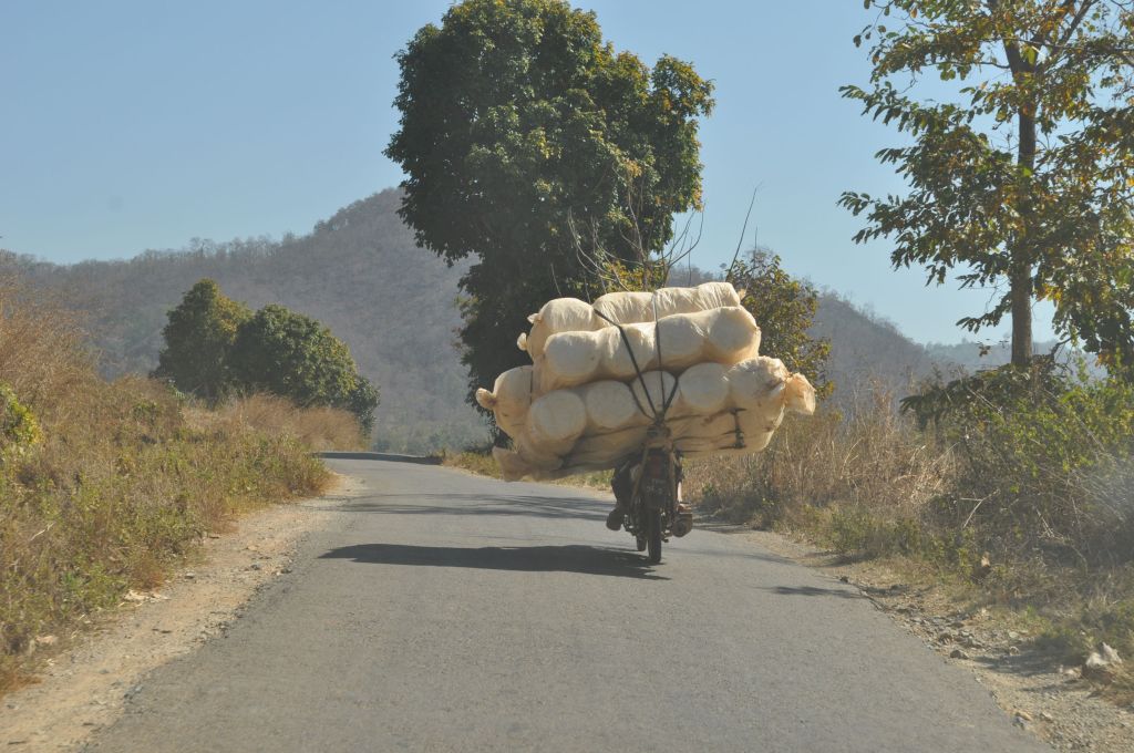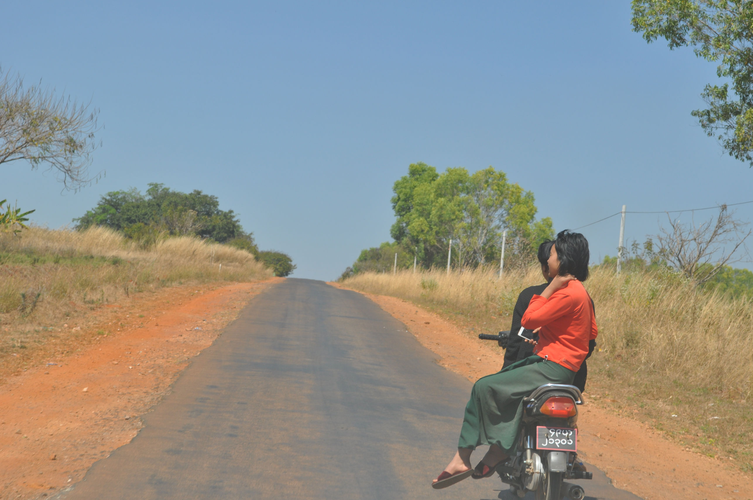 We returned to our driver, Aung Ku Zin, who had been waiting in the shade for us the whole time. He is a friendly man and a remarkably safe driver. He also used some English to explain some of the sights we passed such as garlic fields and the Taunggyi University. Our trip from the resort to Kakku was 1 ½ hours, and the trip from Kakku to the Heho airport was two hours. We had the opportunity to see much more of the Myanmar countryside, this time Shan State in particular. We particularly enjoyed seeing the people we passed on the road, women often riding side saddle on bikes, bikes loaded down with incomprehensibly large loads, a truckload of ducks, trucks filled with people and more people on top. There are no lanes, and there is a natural flow of faster vehicle passing slower vehicles while looking out for oncoming traffic on the single lane strip of pavement.