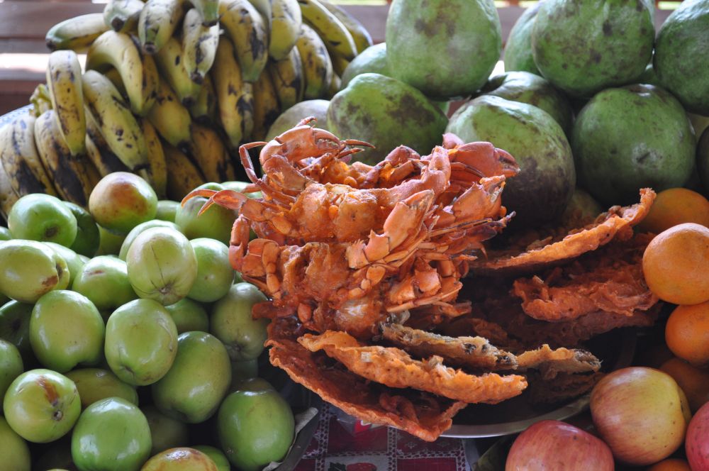 The popular thing is to see the bridge at sunrise, but we were there at midday. Still, there were plenty of tourists. This, unlike the Mahamuni Buddha temple, draws the masses. People hawked their wares all over the parking lot and the roads up to the bridge, and for a good portion along the bridge as we walked it. I was very excited to see my favourite snack of Myanmar – sliced green mango in chili powder – sold here, and I bought some within minutes. M’s tummy was still upset and she didn’t share the spicy treat with me. In fact, she was still feeling poorly when we had walked all the way to the end of the bridge and back, so we bought a coconut to drink the milk and fill up on natural electrolytes.