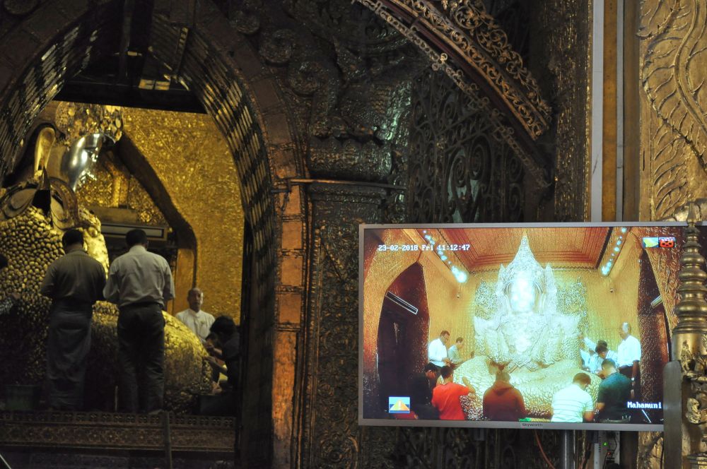 Our next stop was miles away so we hired a taxi. The hotel front desk had told us that the wood craft shops were near the Mahamuni Buddha Temple, so we asked the taxi driver to take us there, just to give him and easy landmark to aim for. We had no plan to visit the temple at first. But our driver brought us to a quiet street with a less popular entrance, and the quiet was inviting. We decided to step inside and check it out, since we were there anyway. It was a good decision.