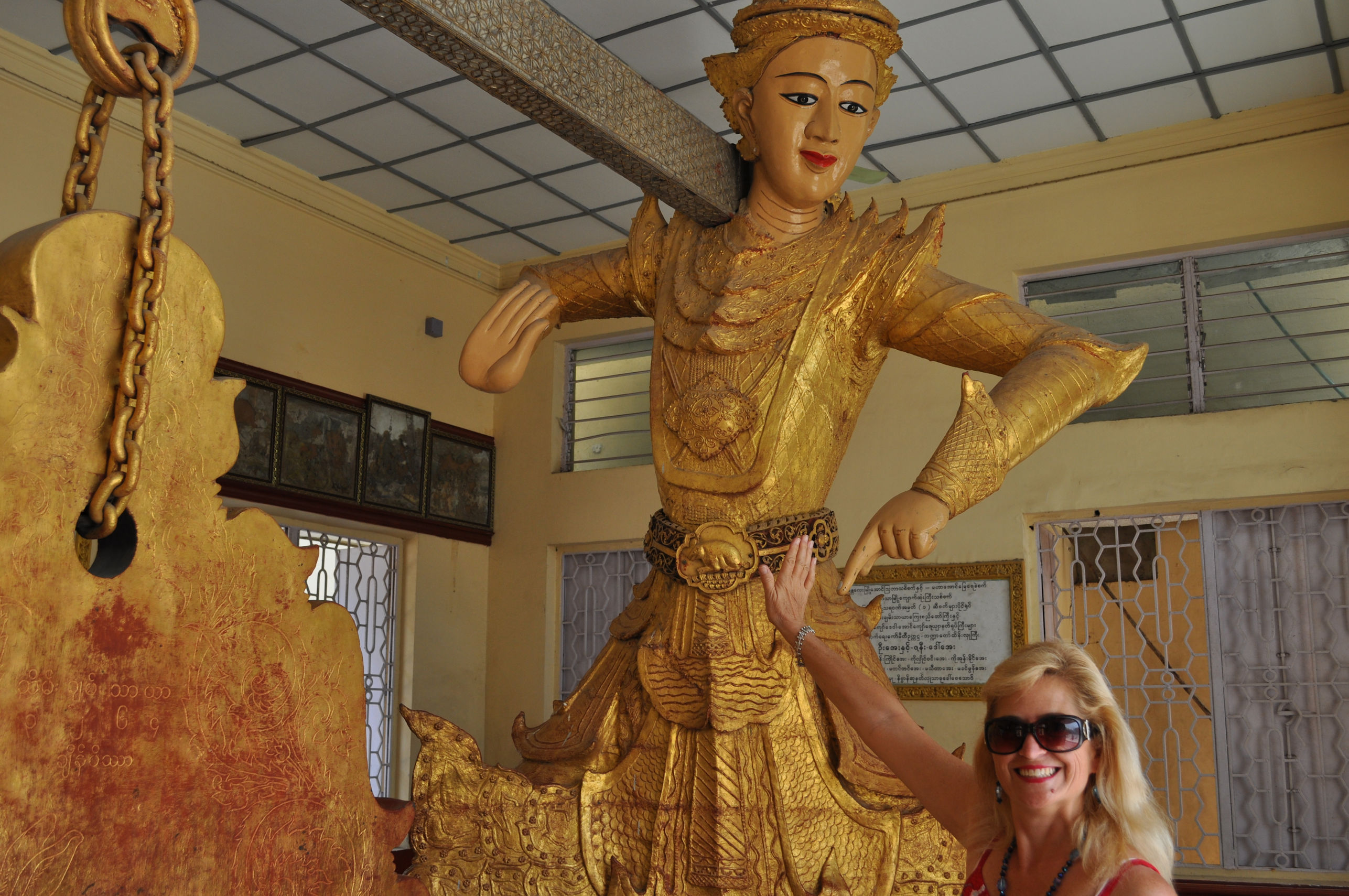 The temple proper was surrounded by pillars encased in jade in myriad mosaics. It was specatacular, all green and glistening in the sun. Just inside, we found the Mahamuni Buddha. Like we saw at the Golden Rock, worshipers bought gold flake and applied it to the Buddha while praying. Again, only men were allowed to do this. Women sat in rows outside, praying. And for the benefit of the people outside, there was a livecam going the whole time, so we could watch our men apply the gold. We continued on and realized this was a large complex with museums and other holy sites. We explored bronze sculptures on display, magnificent art, artifacts, a giant gong, several giant bells, and additional pagodas. There were at least four separate museums with different categories of collections. One appeared to hold manuscripts, and looked something like a library, with books, parchments, and even dusty old cassette tapes.