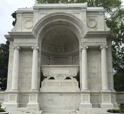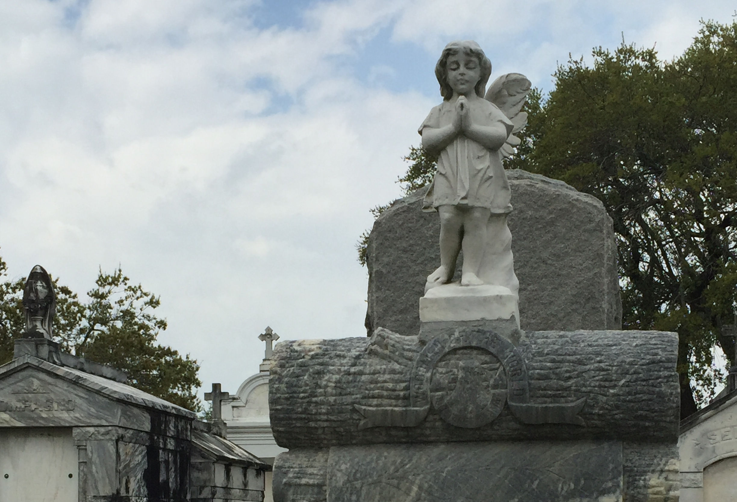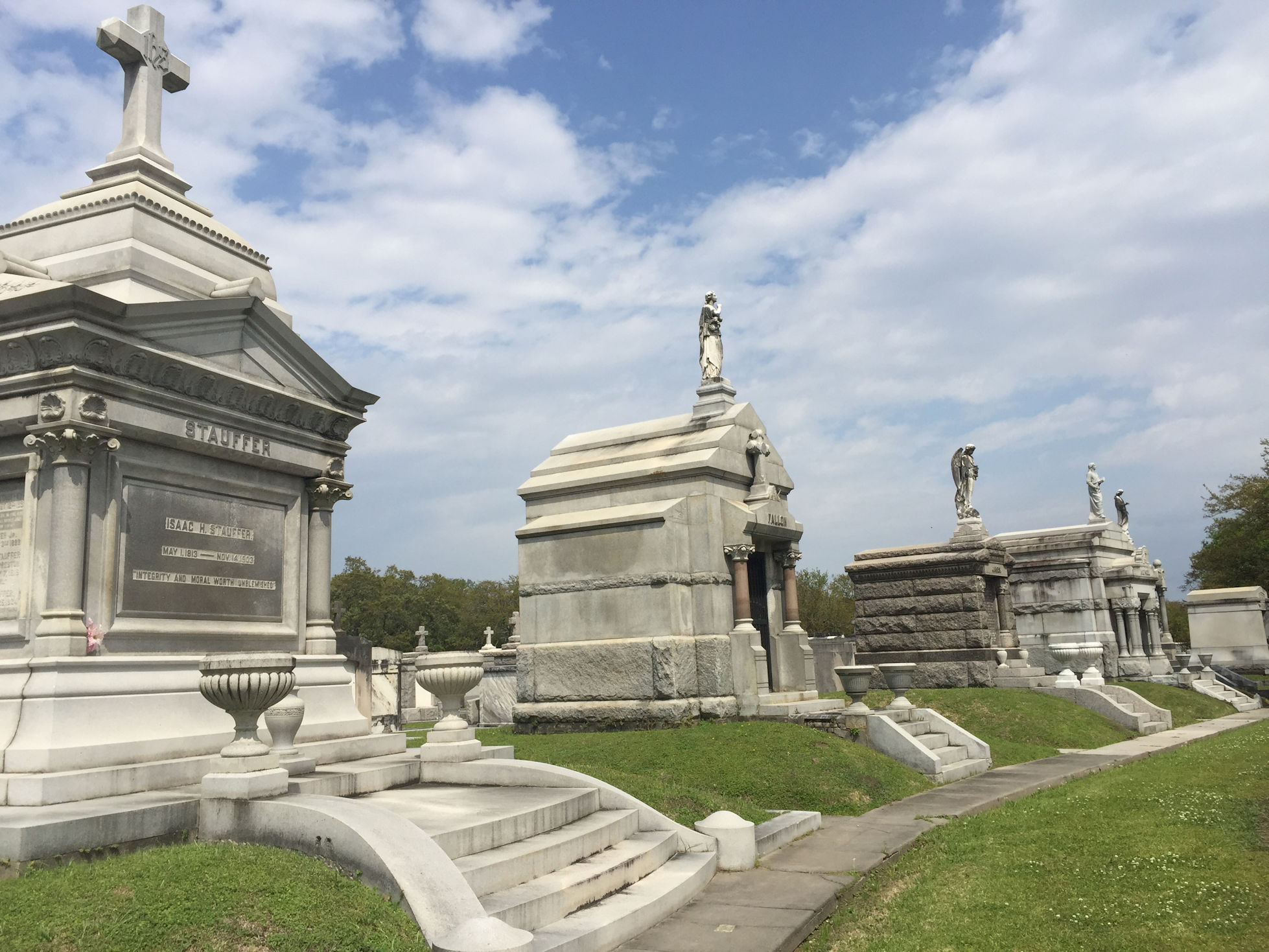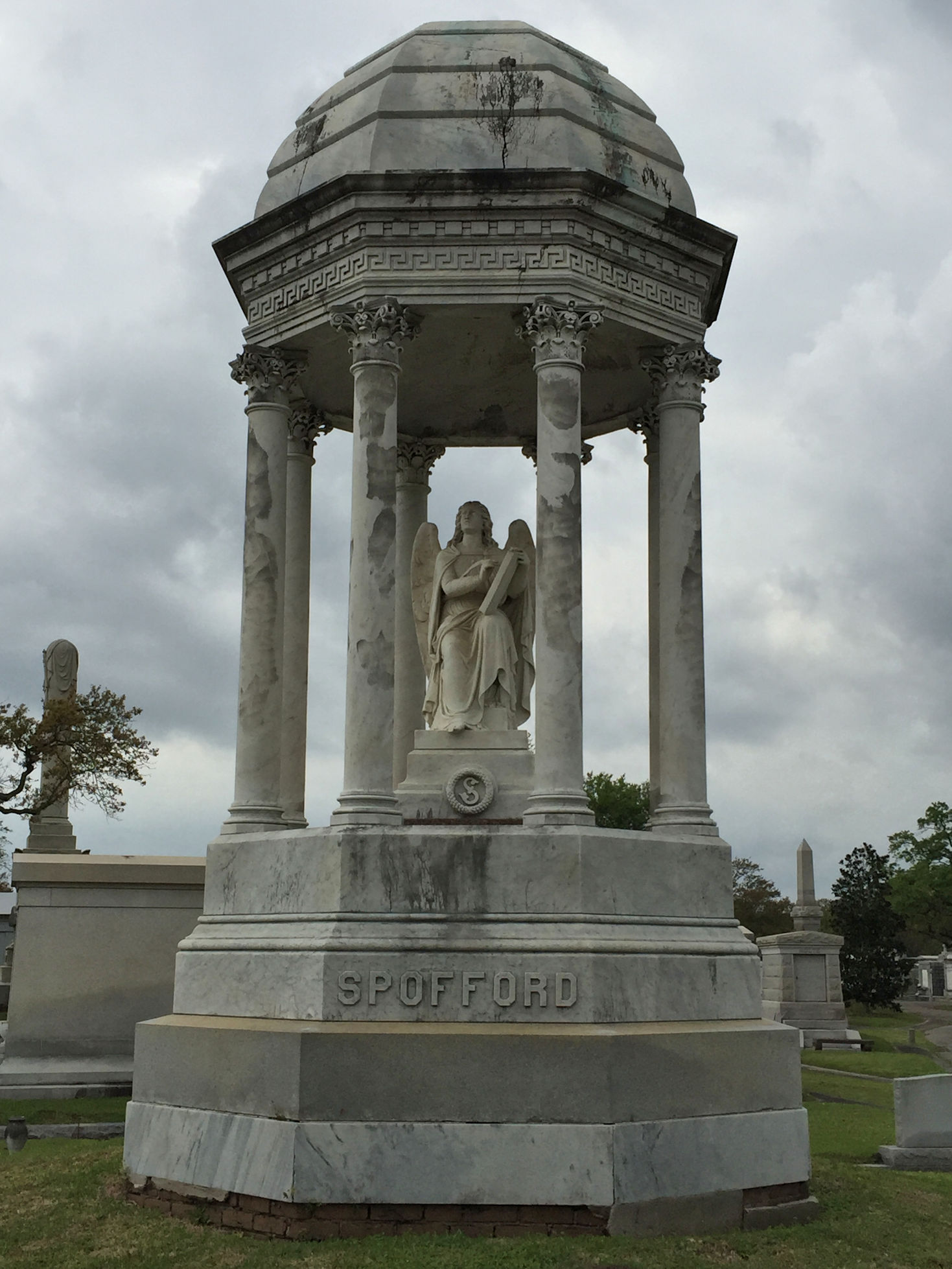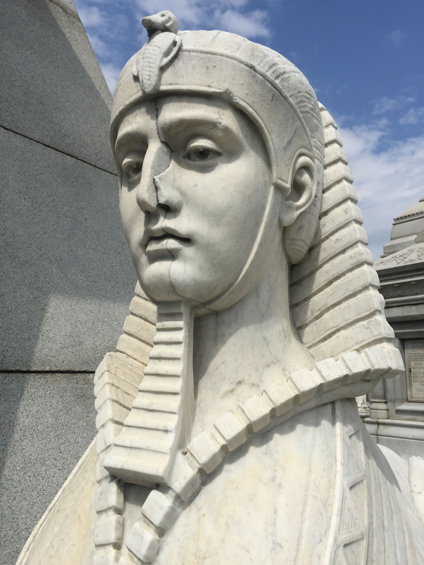 We went to Metairie Cemetery first. Built on the site of an old racetrack, some of the curved shape of the track can still be seen today. The cemetery is simply gorgeous, with white shining marble everywhere, manicured lawns and mature trees. Patrick wanted to see the weeping angel first, so we drove to it and parked the car. You can see my photo of her above. The expressiveness of the statue is heartbreaking, and the inscription “Sister” at the base brought tears to my eyes.