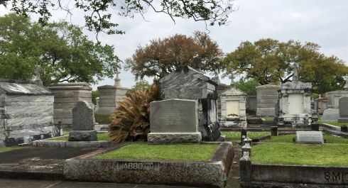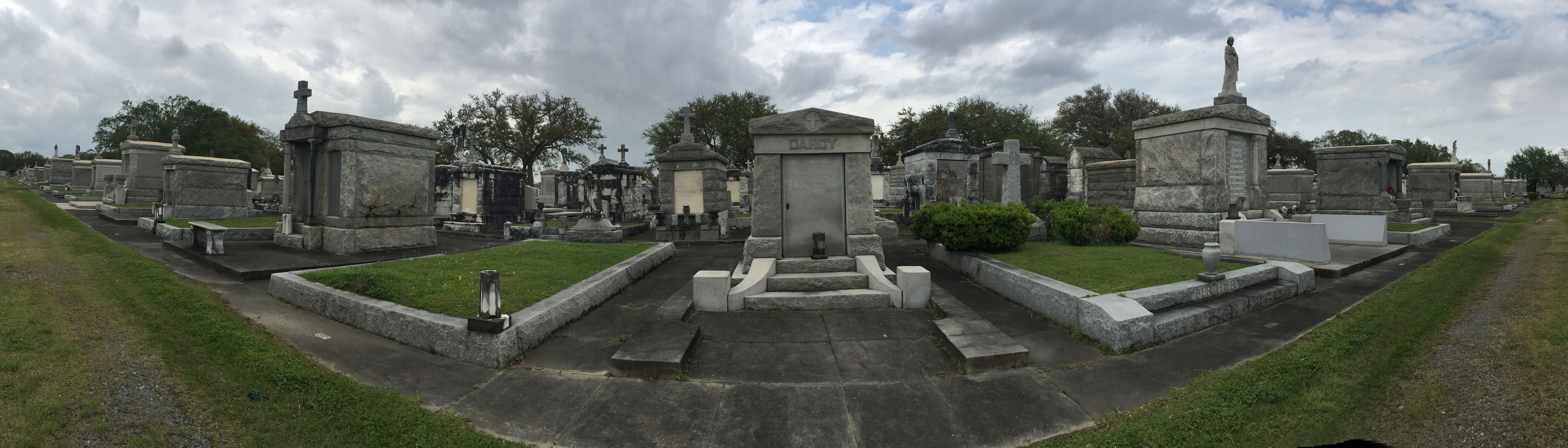 The city was founded in 1718 and people have been dying there ever since. As you know, half of the city of New Orleans is below sea level and protected with dikes and flood walls and massive water pump systems. It doesn’t take too much imagination to realize that you don’t want to bury your dead in the ground. So tombs are built on top of the ground. As we walked between them, the ground was often marshy beneath our feet and there were standing pools of water in low spots, reminding us that it is no myth: the city of New Orleans is level with the water table.