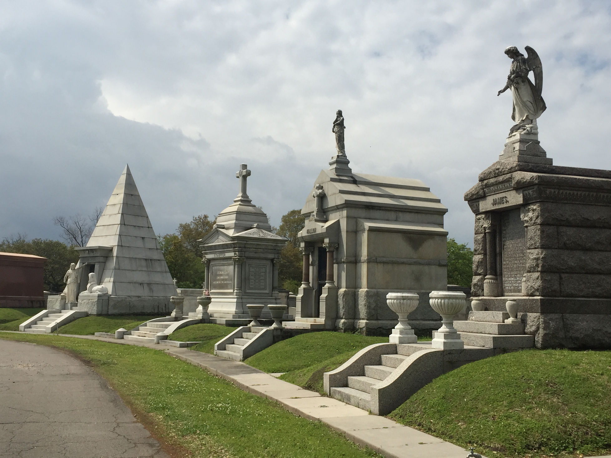 Next we went into the Garden District to Lafayette Cemetery No. 1. This one is famous because author Anne Rice used to live near it and based the tombs of the Mayfair Witches and the vampire Lestat on the tombs she found here. And consistent with that history, this cemetery was more what I anticipated in a New Orleans cemetery: not crumbling apart, but certainly a very old and storied place in the center of busy neighborhood streets.
