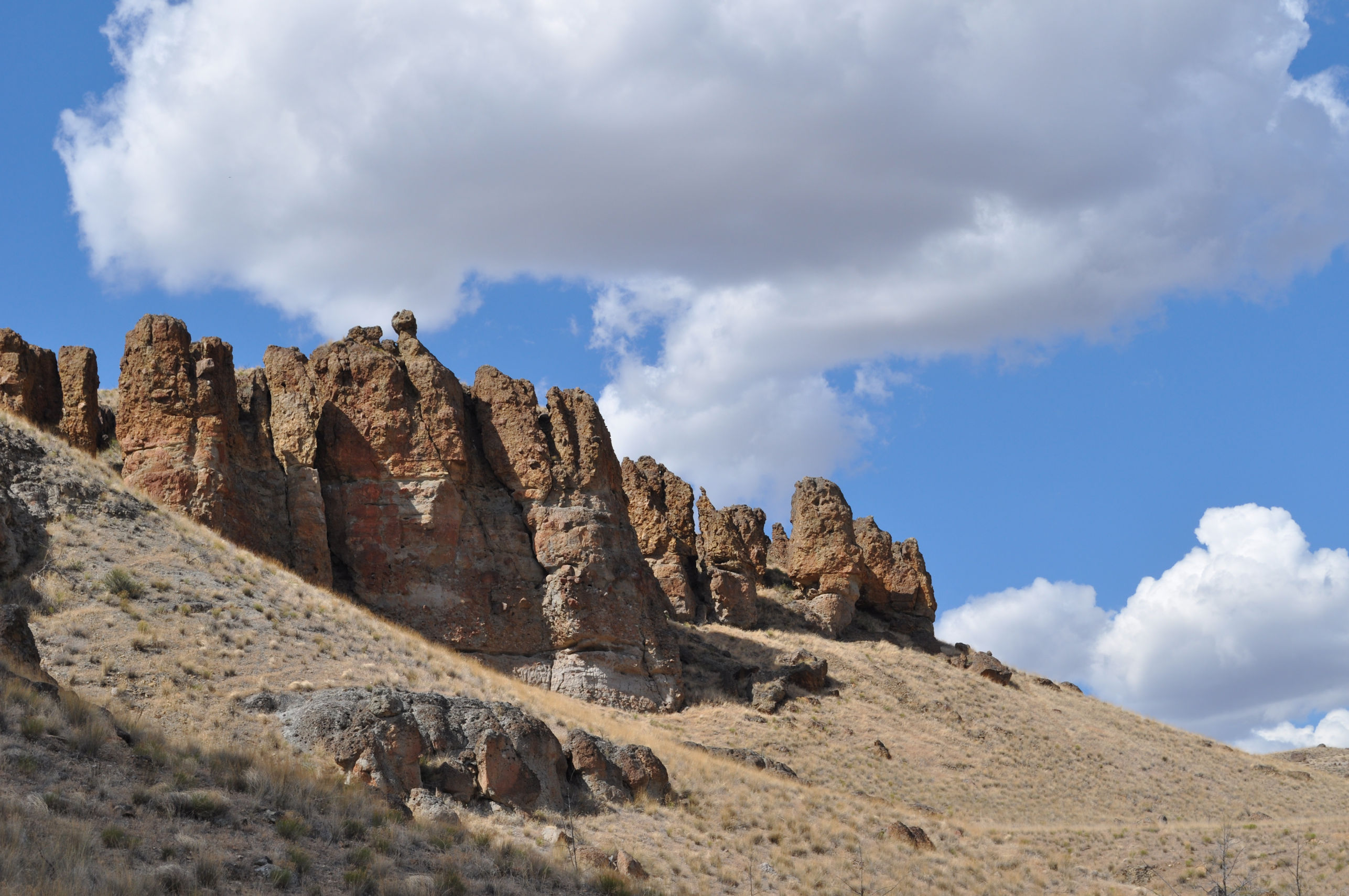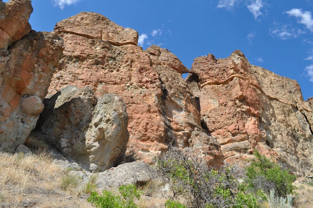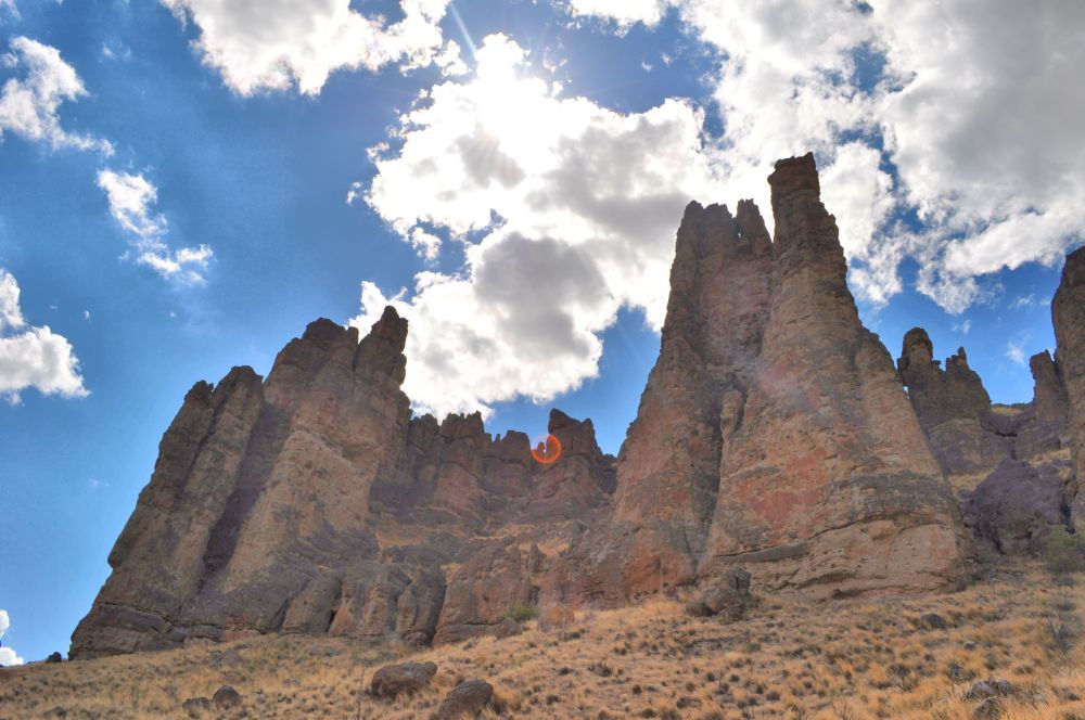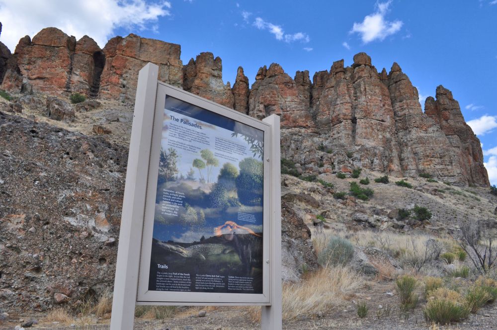 The National Monument is in three pieces separated by quite a distance. Our route to our hotel passed one of the areas, called the Clarno Unit. We arrived in the afternoon and had time to park and explore the trails at The Palisades. The Palisades are interesting and beautiful crags that tower above the highway. They were formed 45 million years ago after a volcanic eruption that filled the valley with mudflows called lahars. There were multiple flows filled with rocks, ash, and other debris that settled in layers. Over the millennia, erosion has formed magnificent towers.