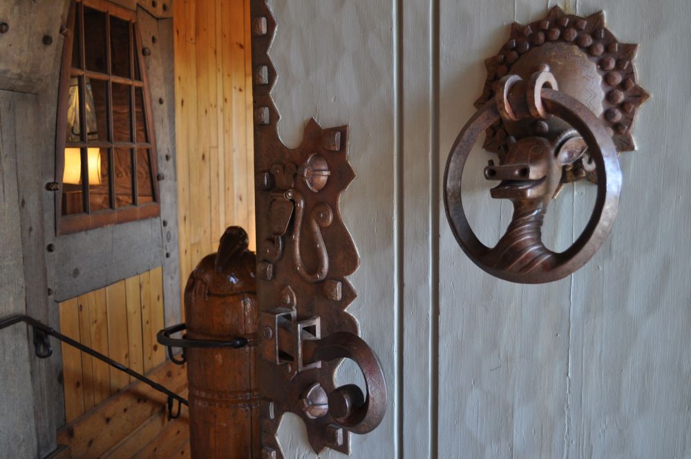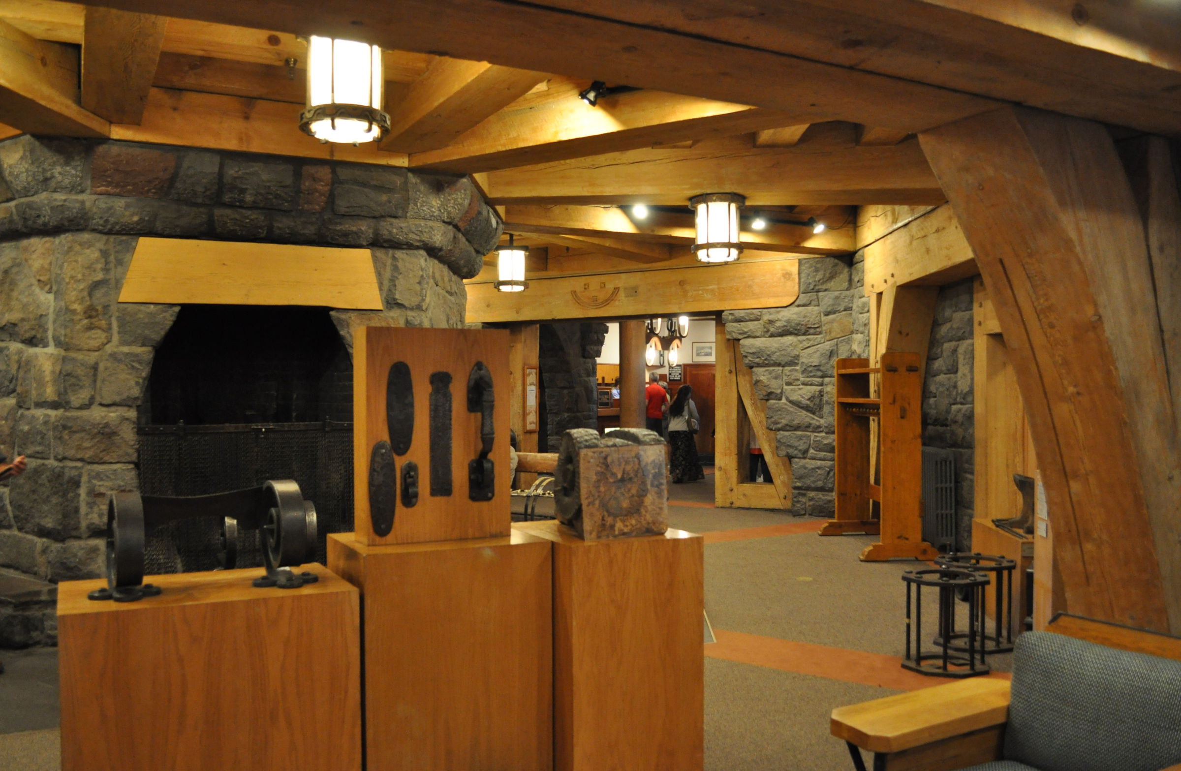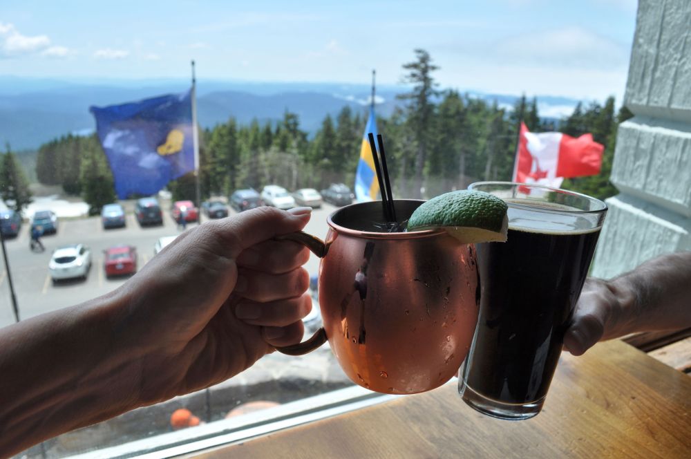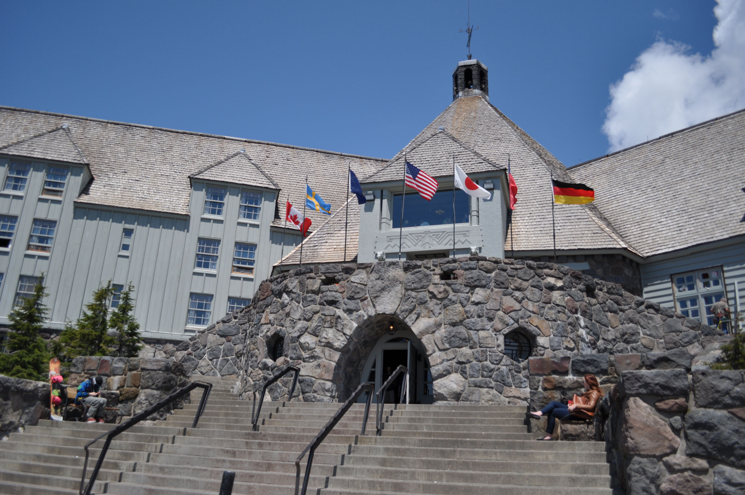 Timberline Lodge sits at 6000 feet elevation. The average snow depth in season is 21 feet. If you decided to hike from the lodge to the summit, it is 3.6 miles away with an elevation gain of 5000 feet. The Lodge was built in 1937. There are guest rooms and two restaurants, and four levels. The lower level contains several small museum-type displays of bits about the history of Timberline Lodge, with original cast-iron hardware, a replica of the bedroom where President Roosevelt stayed, a replica of what an old rescue center looked like, dedications to the U.S. Forest Service and the Camp Fire Girls (A group similar to Girl Scouts. My mom was in Camp Fire Girls for many years because my Grandmother was the troop leader.) Care has been taken with the choice and display of artwork inside. There is a three-story fireplace. How do they do that?!? In full view everywhere are massive, massive timbers holding the place together.